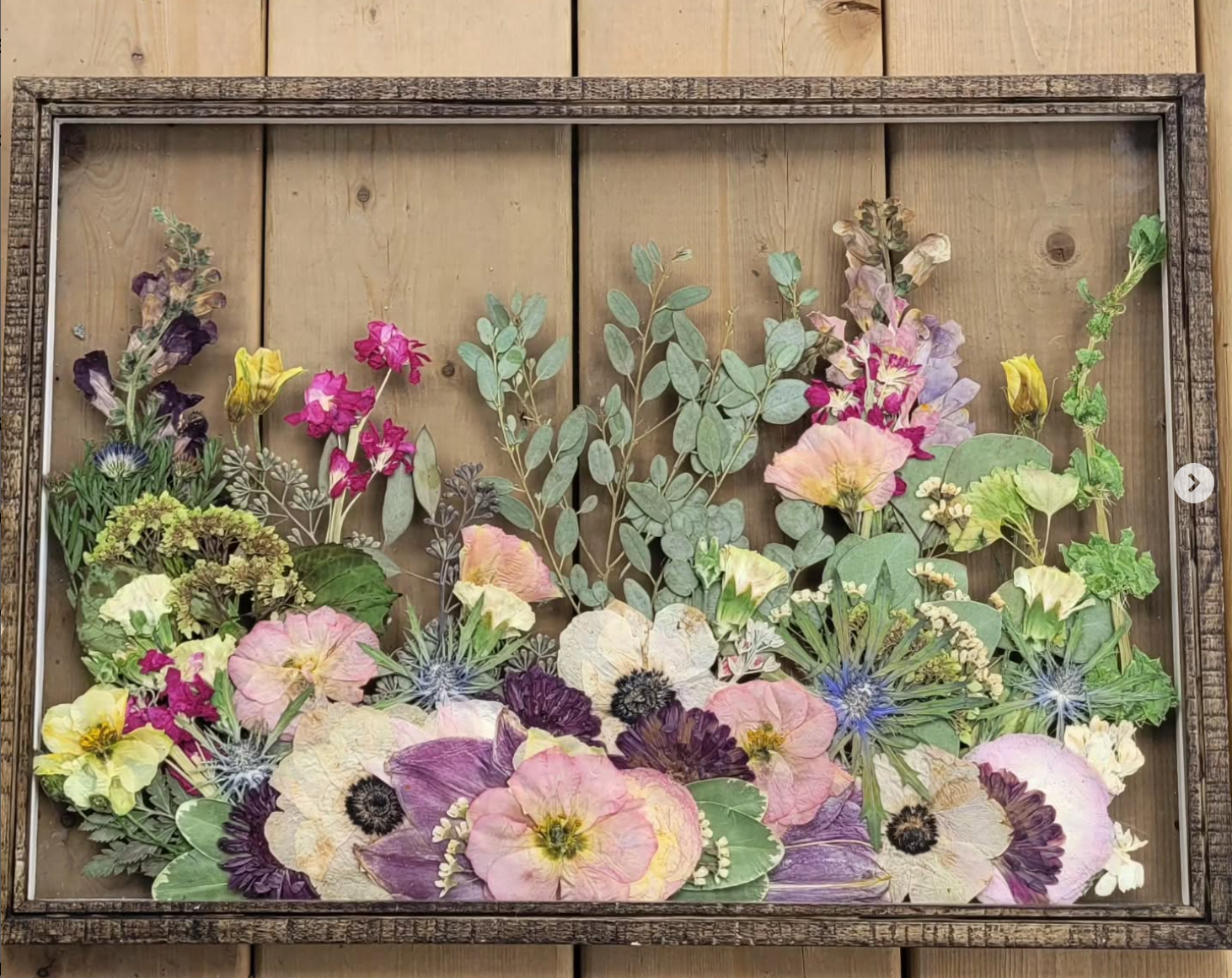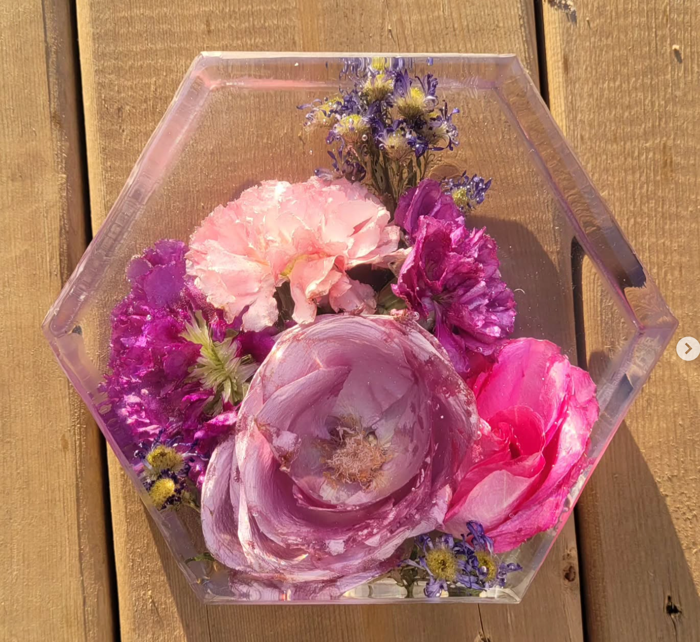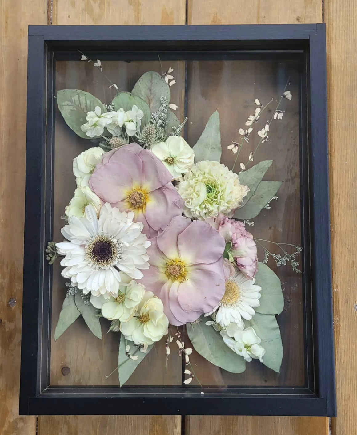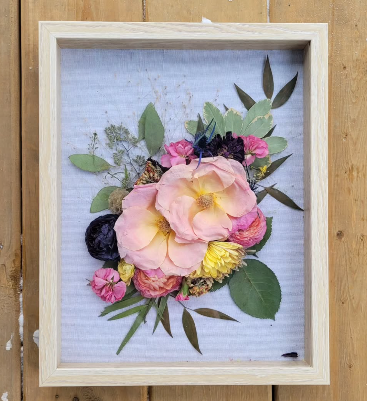 My role in Wilted Wonders consists of pouring epoxy resin, processing and pressing the flowers, customer relations, marketing, book keeping, assisting in framing, and collaborating with Sarah on a daily basis. I hope to one day solely be doing Wilted Wonders work, to preserve as many sentimental bouquets as possible.