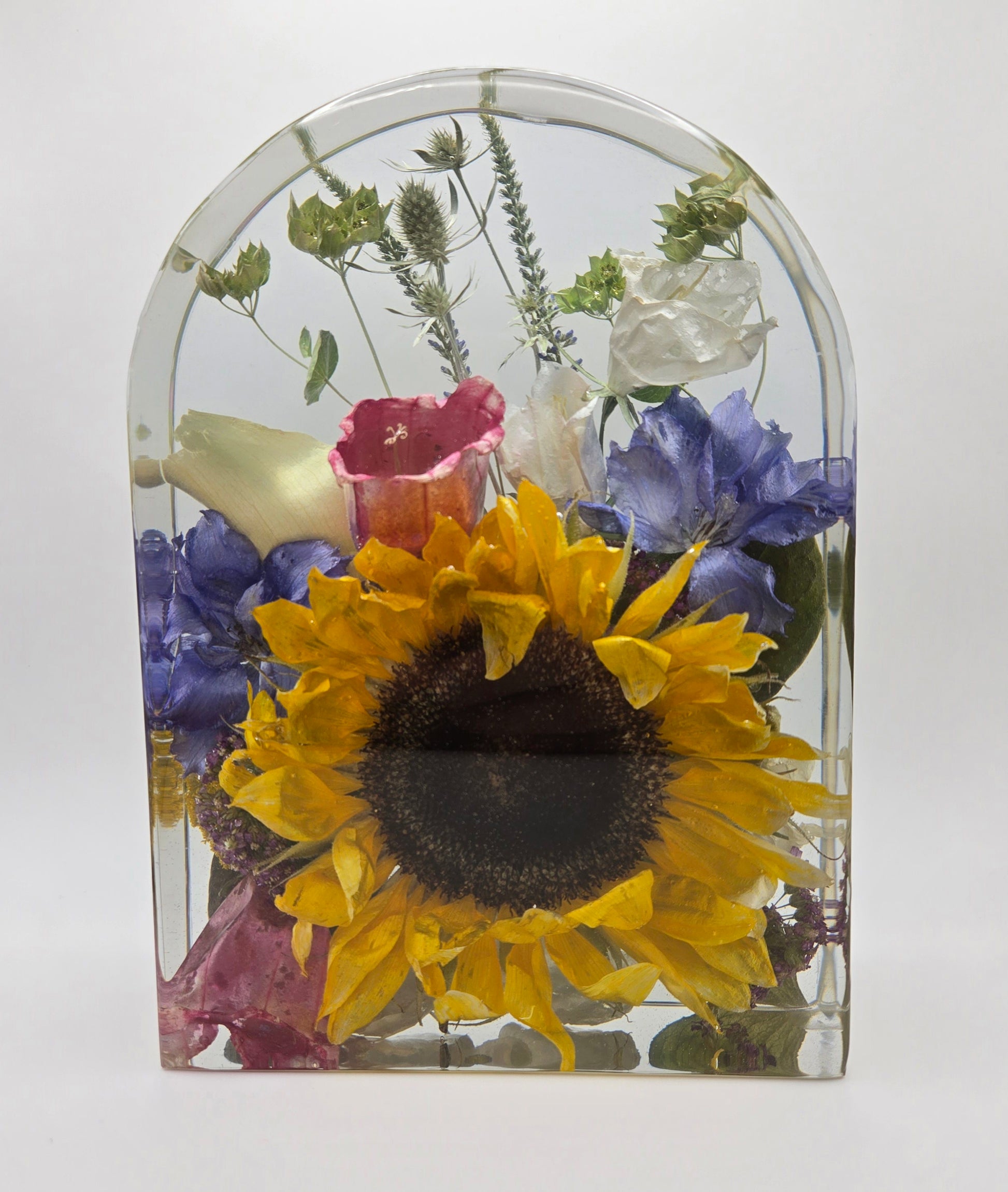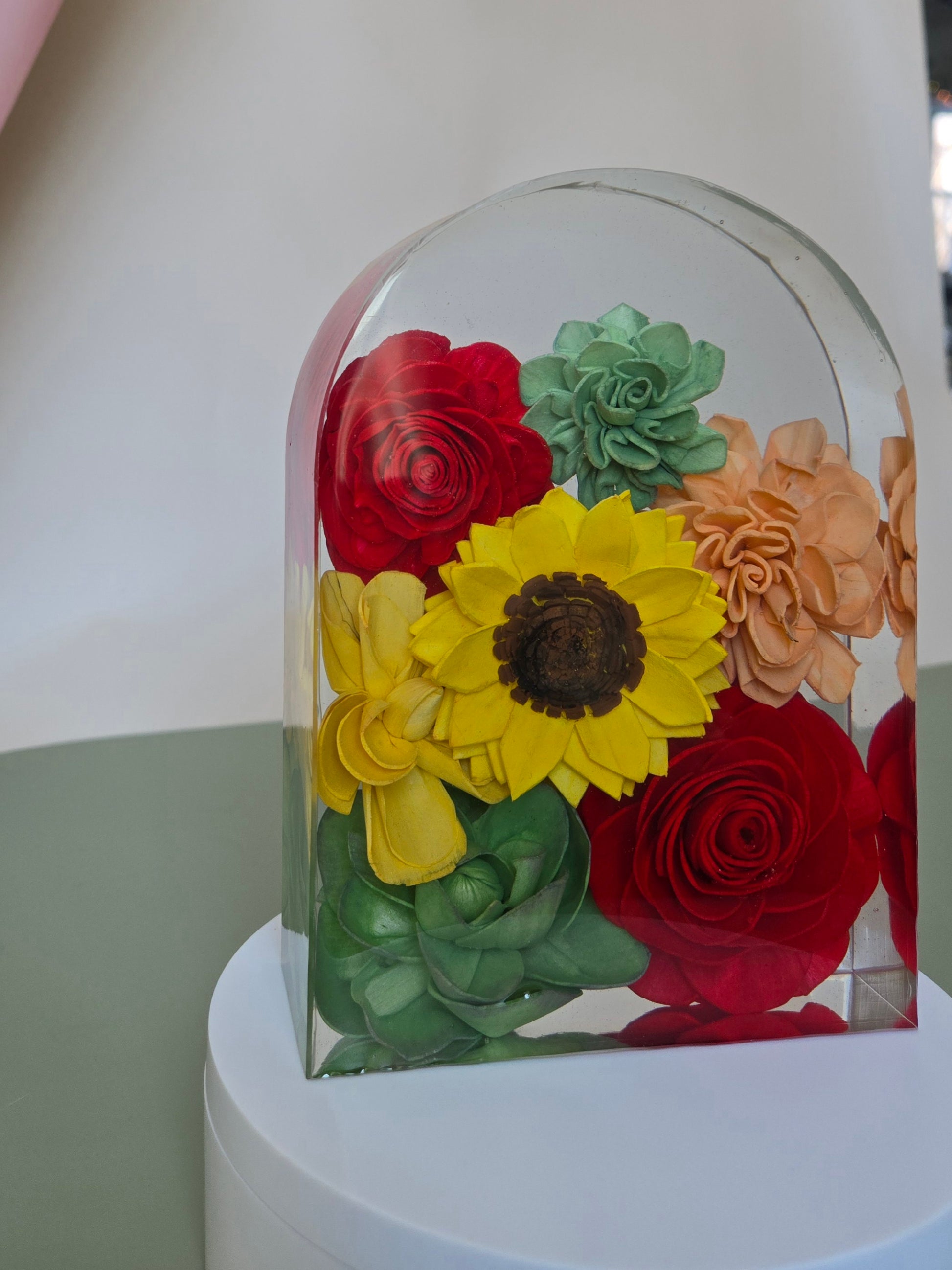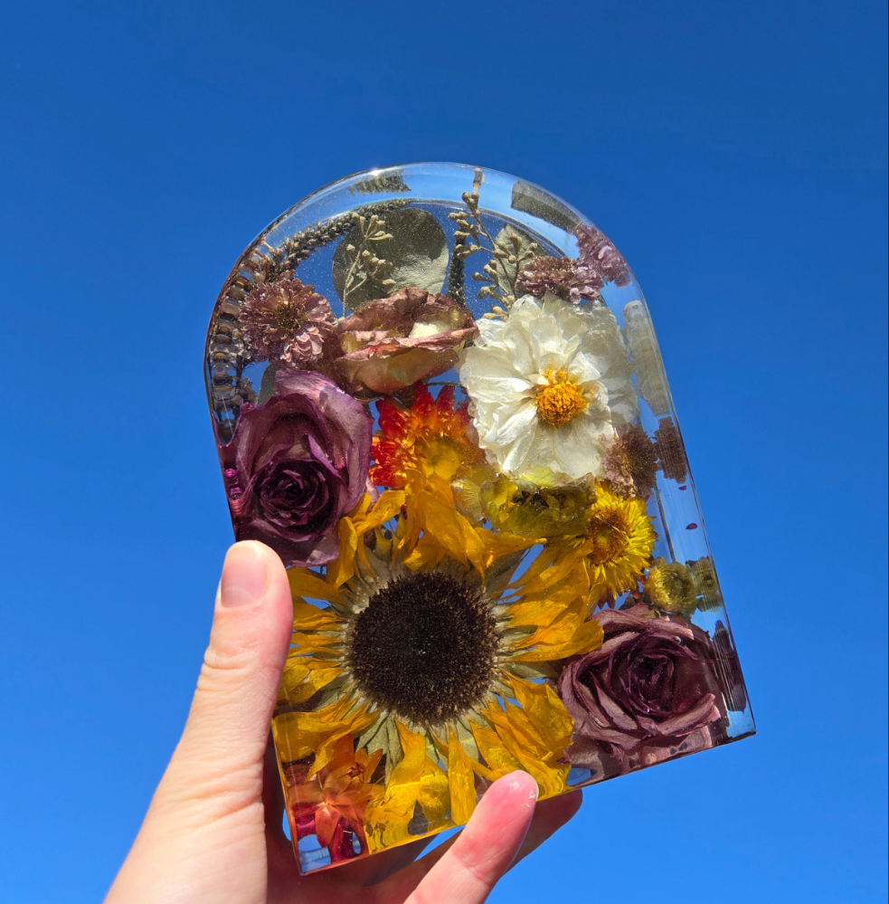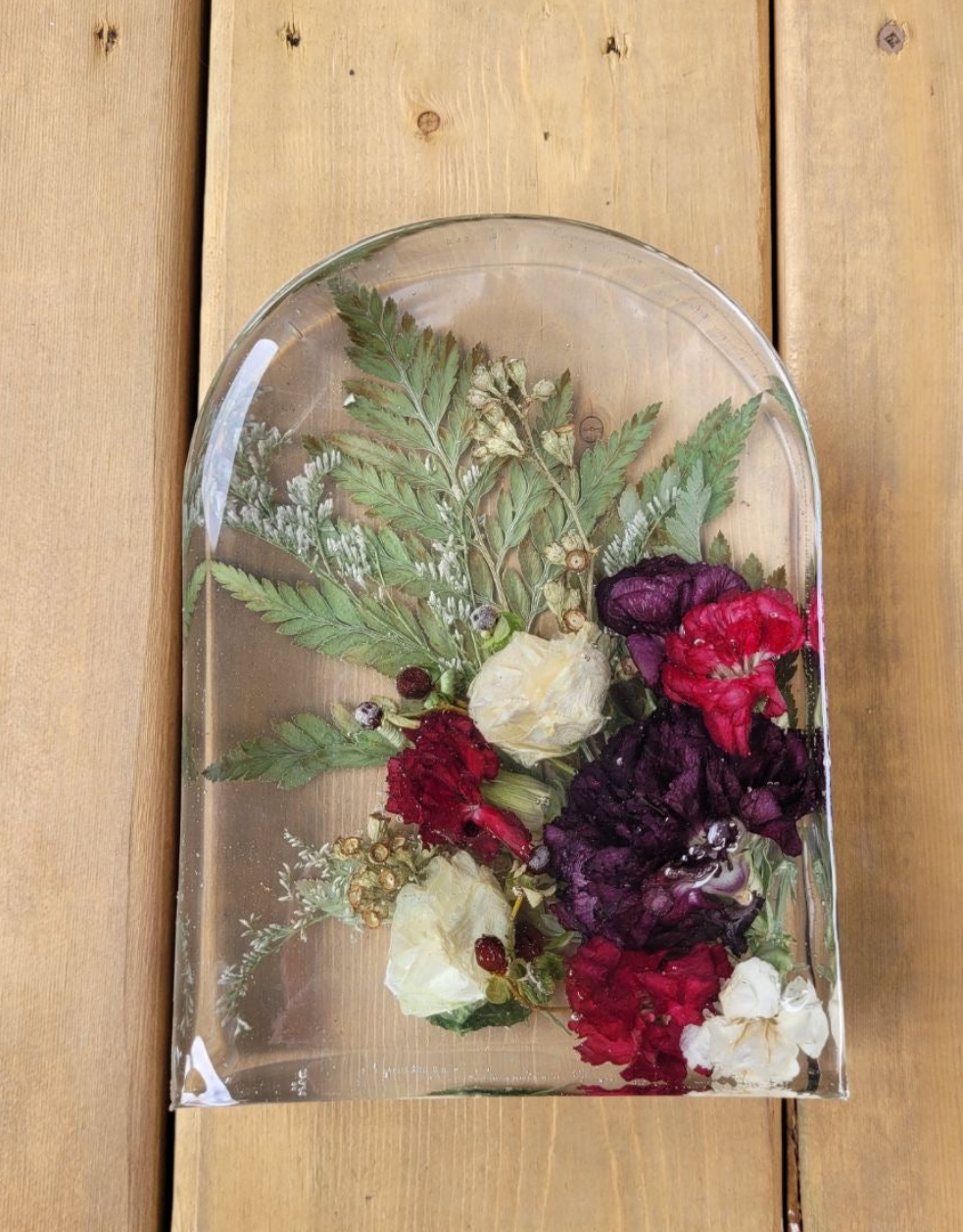 This elegant resin block is perfect to showcase a portion of your bouquet. It is large enough to capture the essence of your bouquet without being too large. The compact size is perfect to display on your shelf or nightstand.