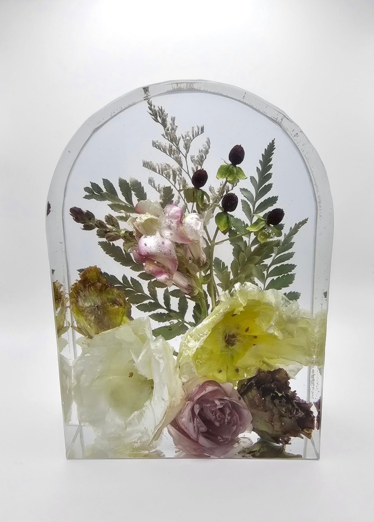 This beautiful arch really brings makes the flowers pop. Contains lisianthus, roses, and a variety of greenery. This is a statement piece that could look beautiful anywhere in your home.