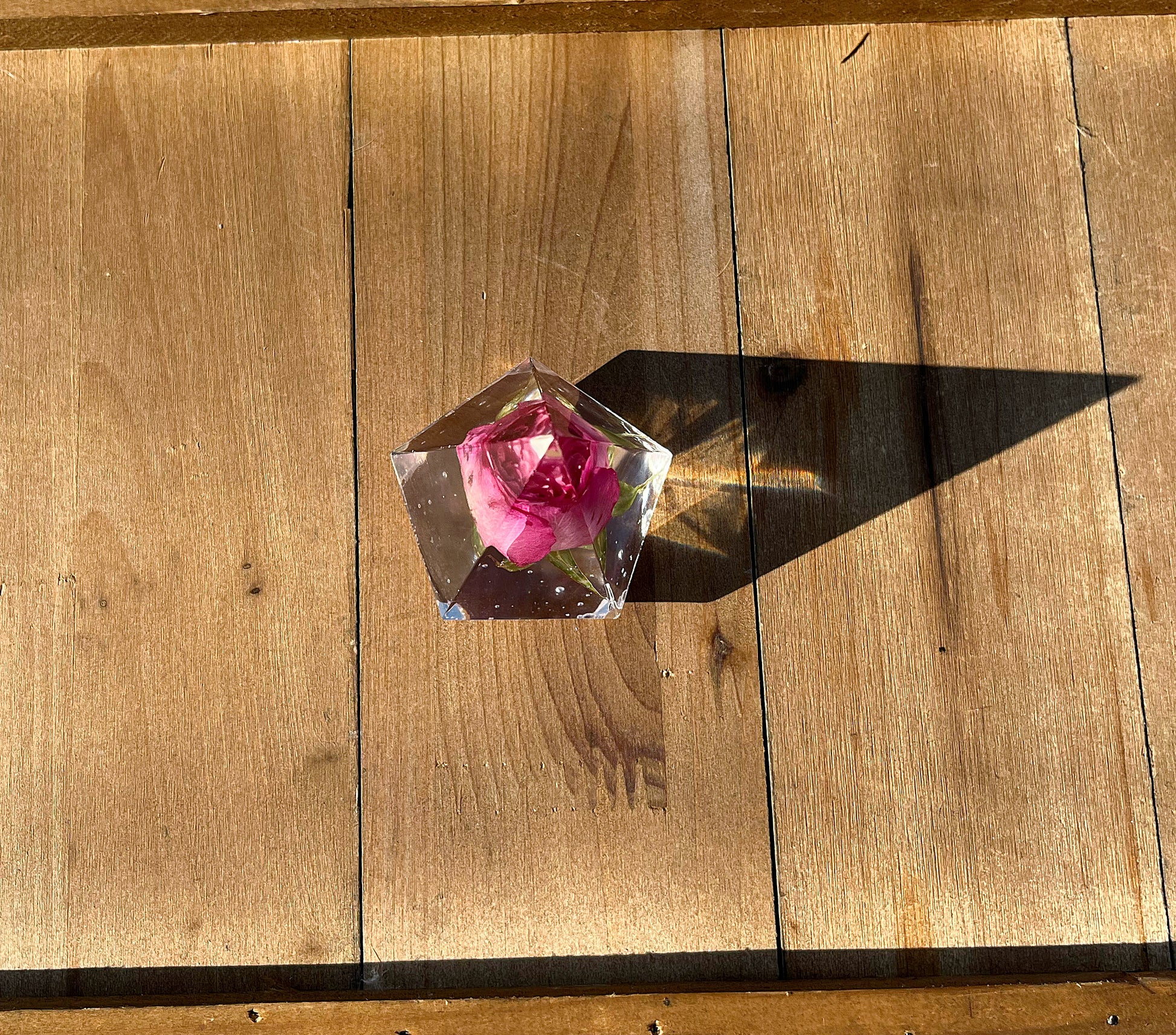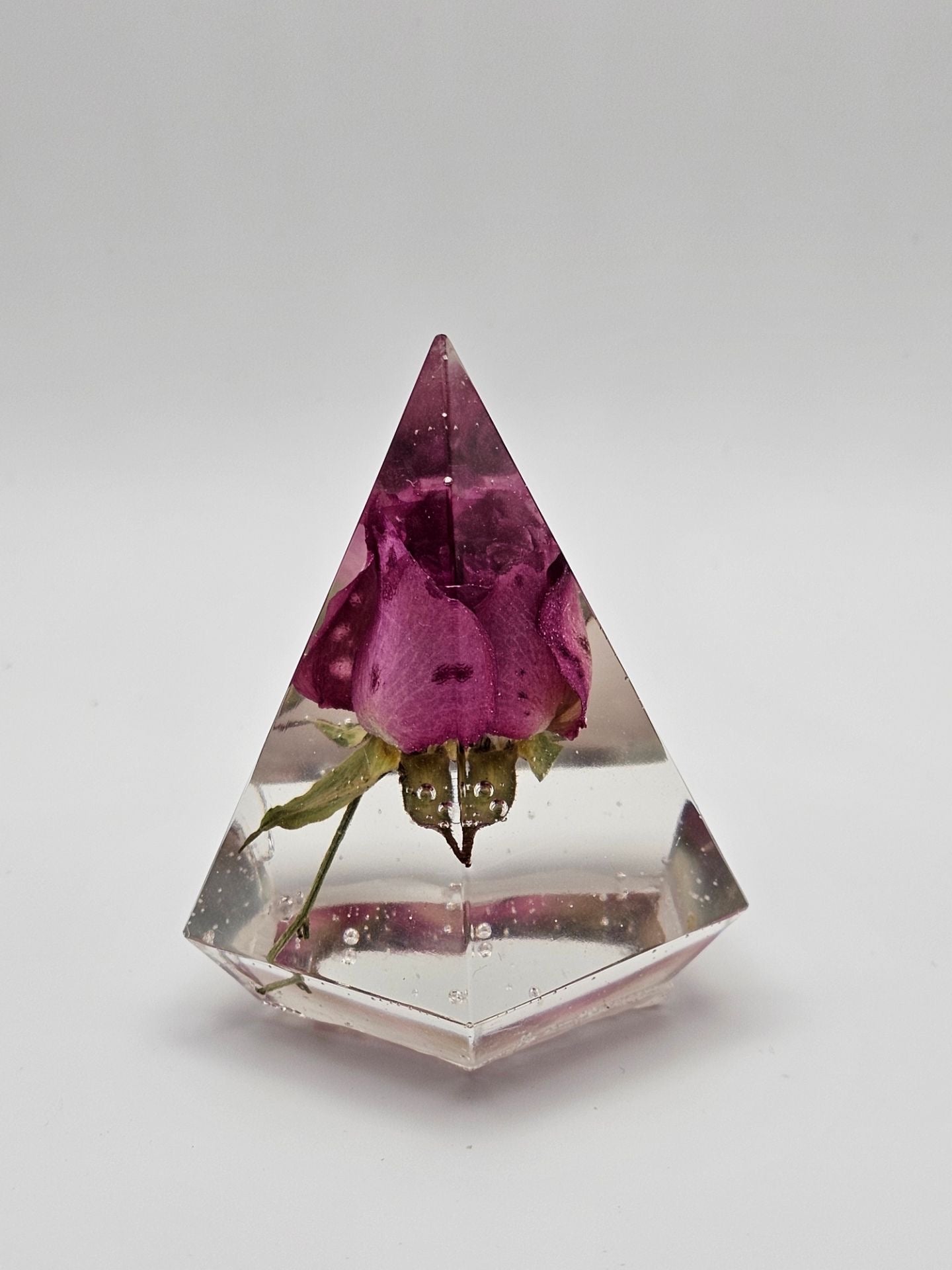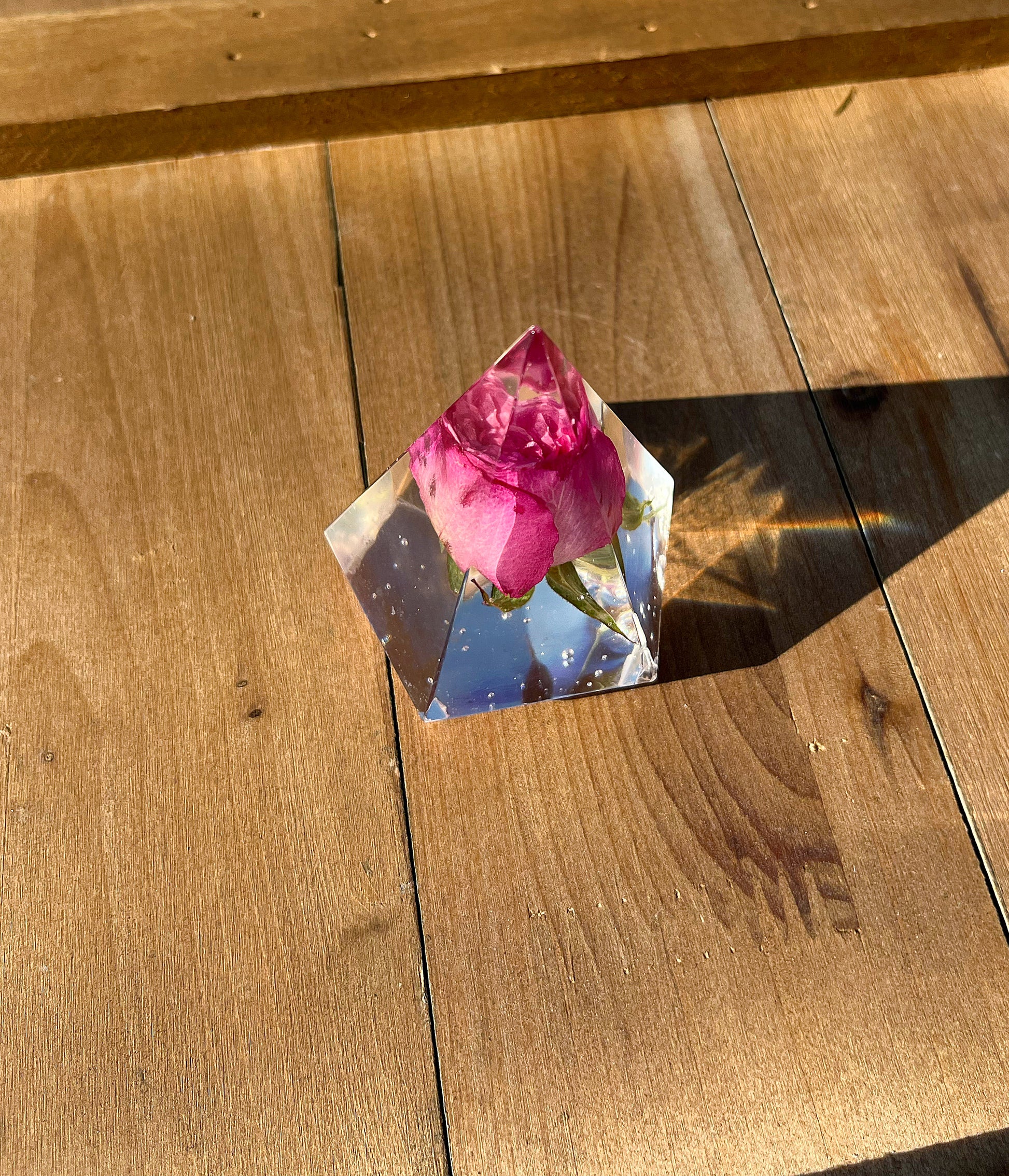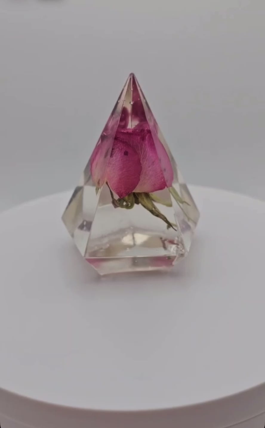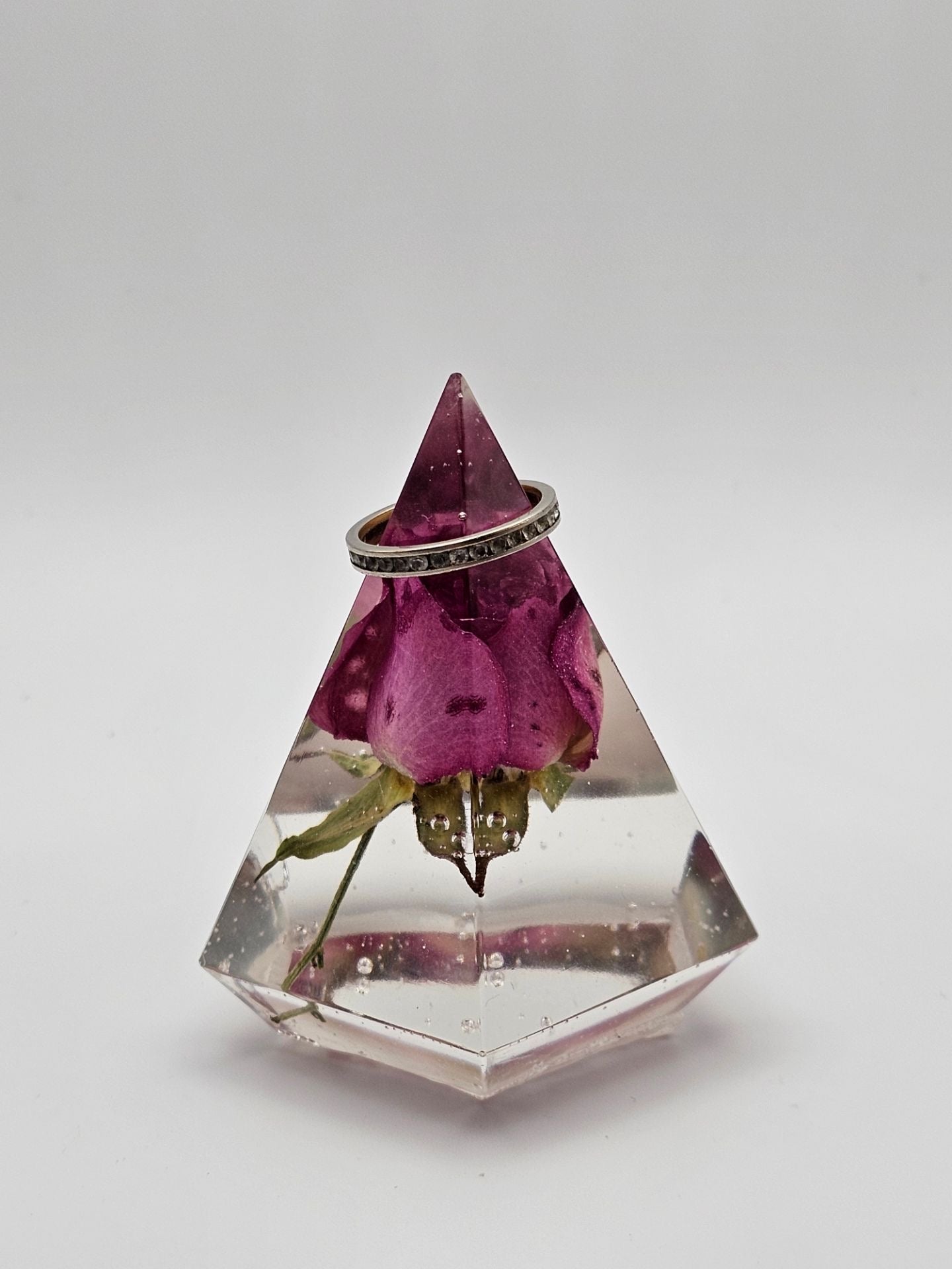 A sturdy stand to hold your rings when you're not wearing them! Each ring holder is handmade and one of a kind. Epoxy resin with a pink spray rose.