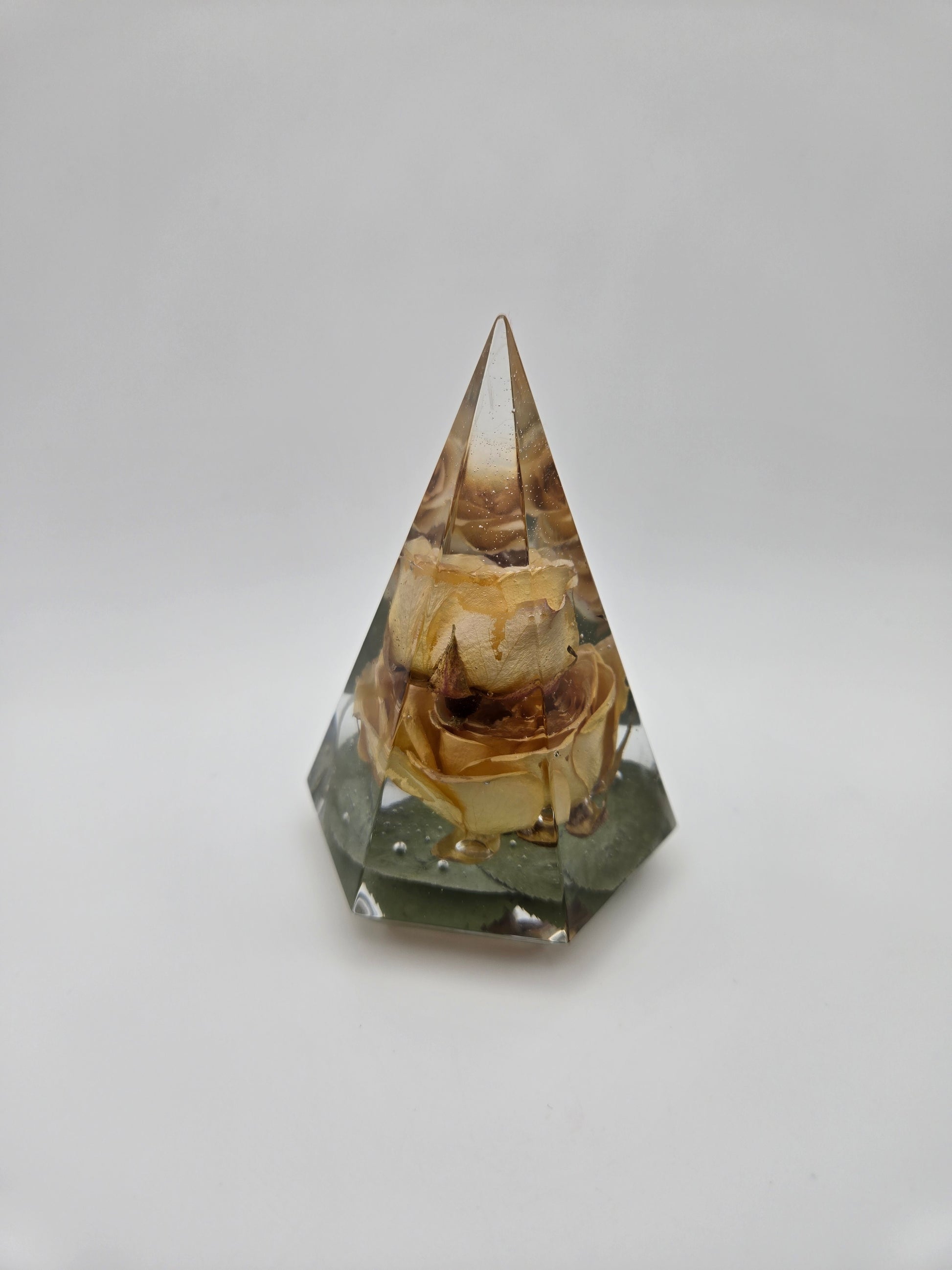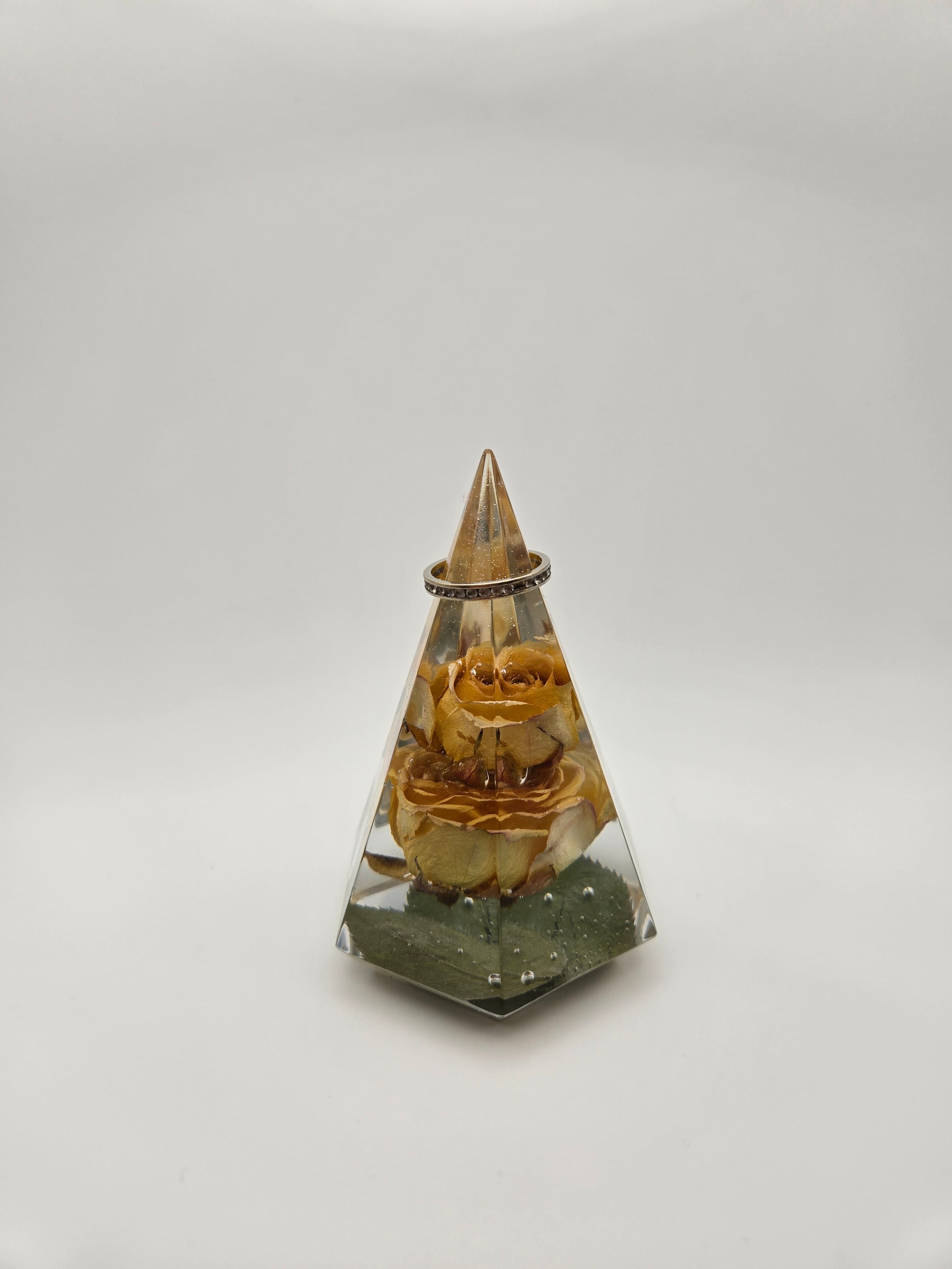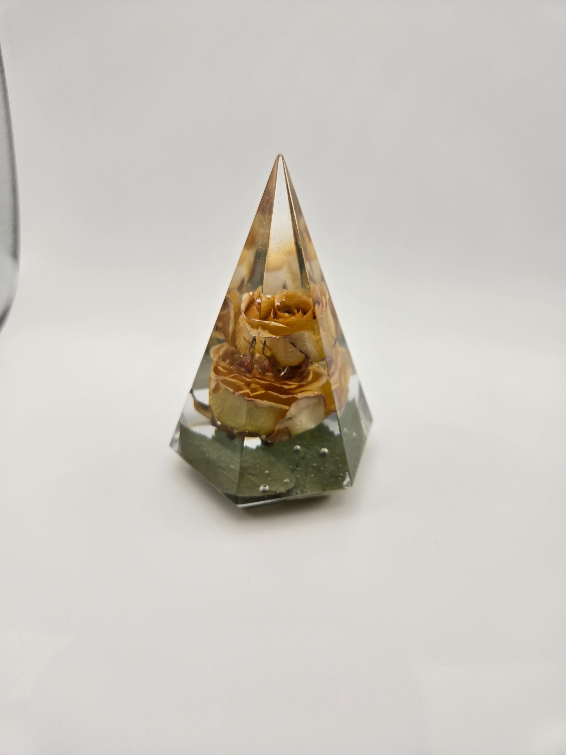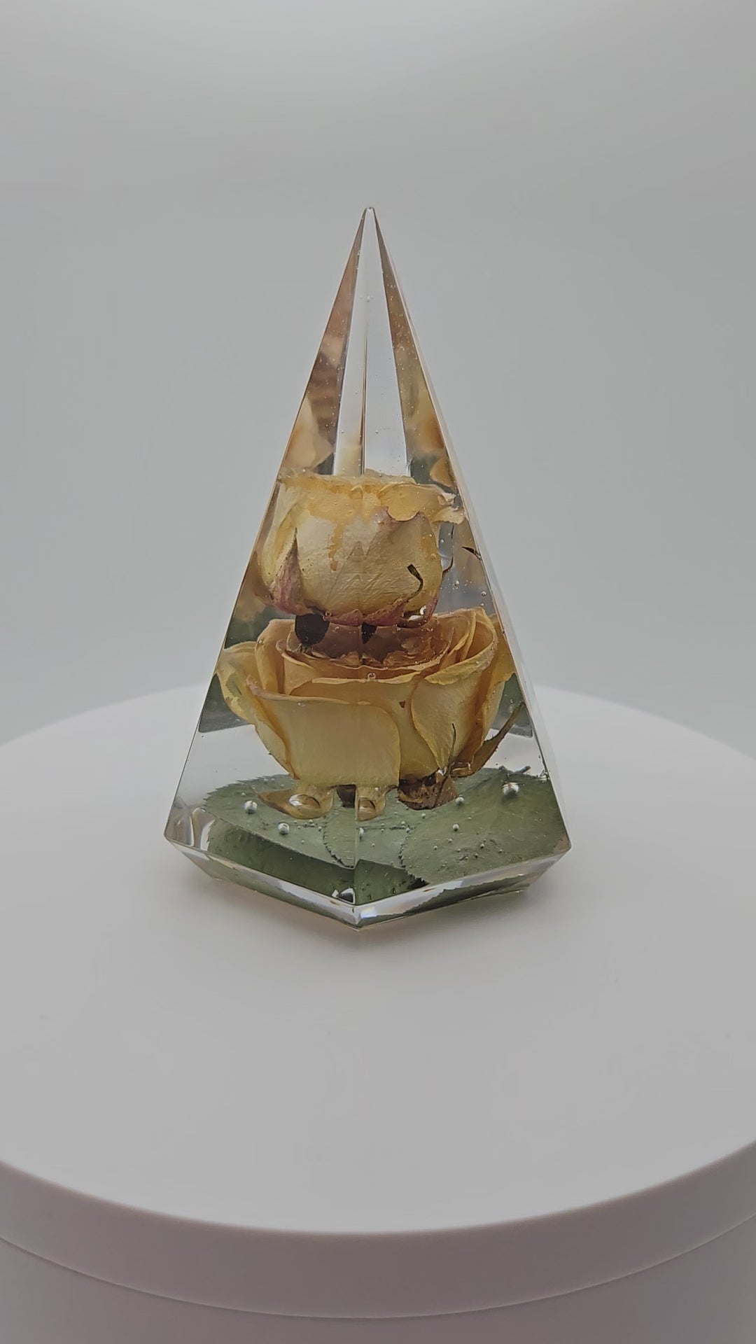 Made with epoxy resin containing two yellow spray roses and greenery.