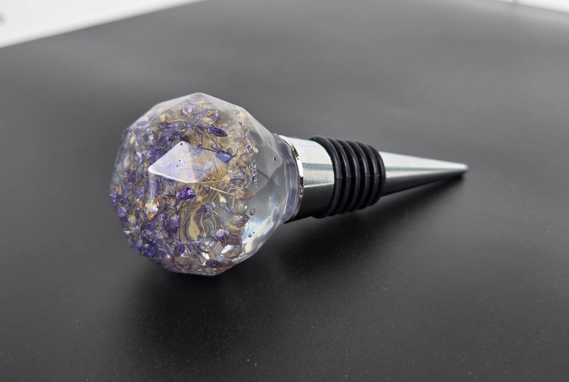 Handmade and one of a kind wine stopper made from epoxy resin and real preserved flowers. Featuring a strange but cool purple flower.