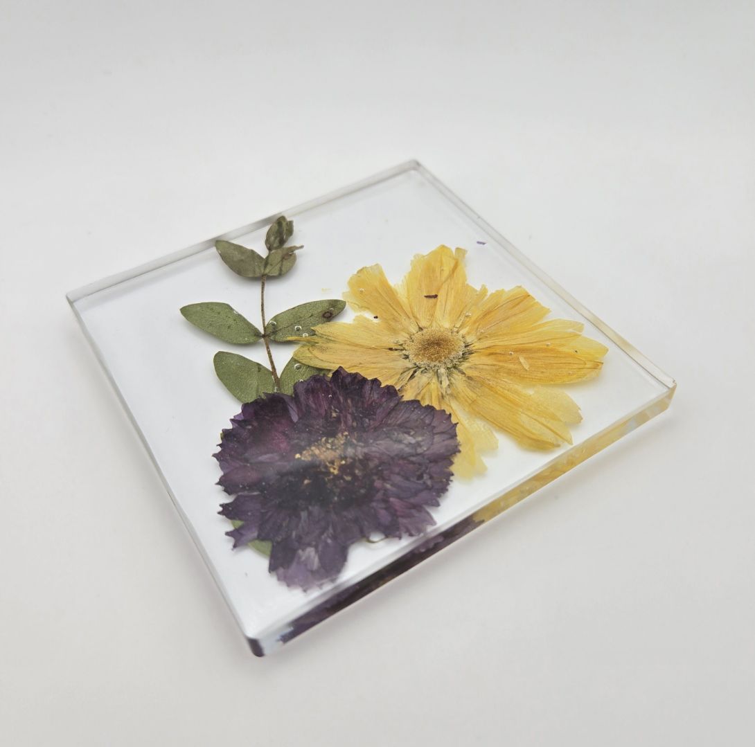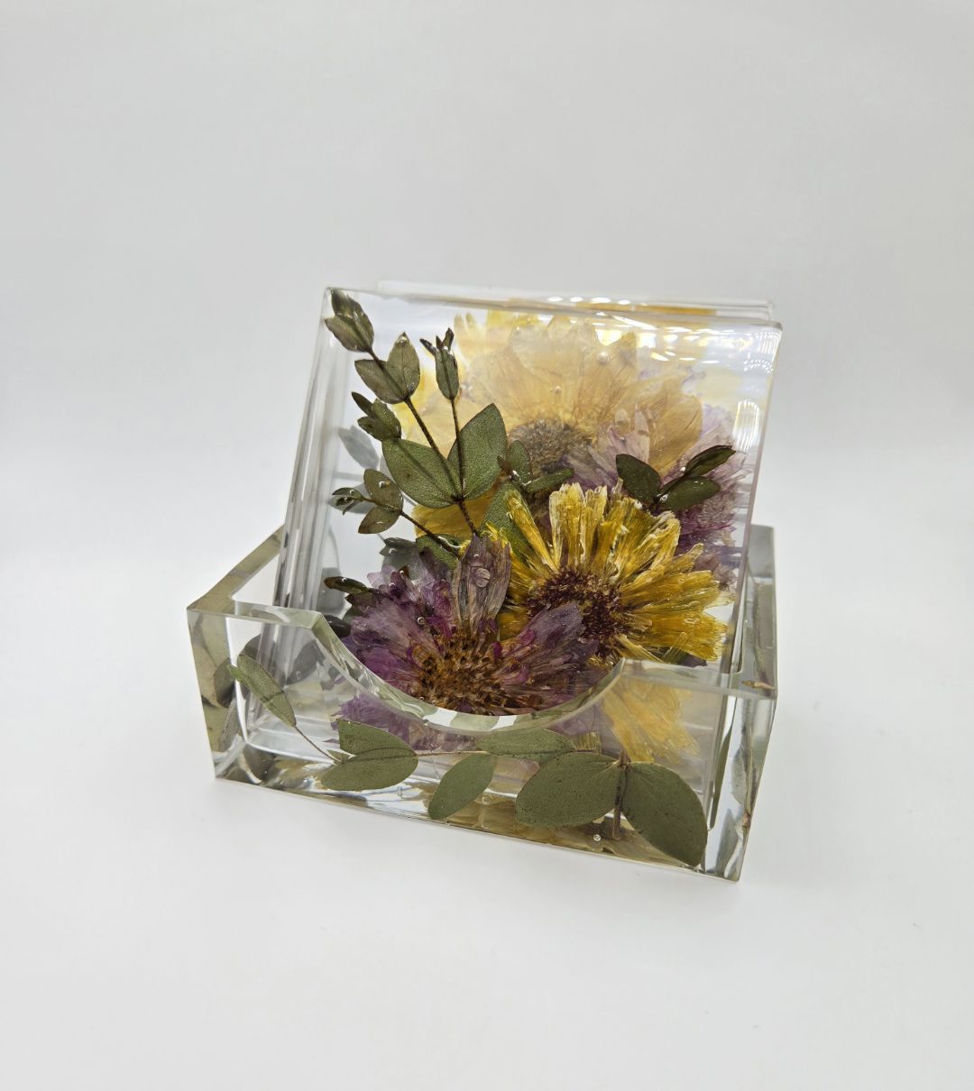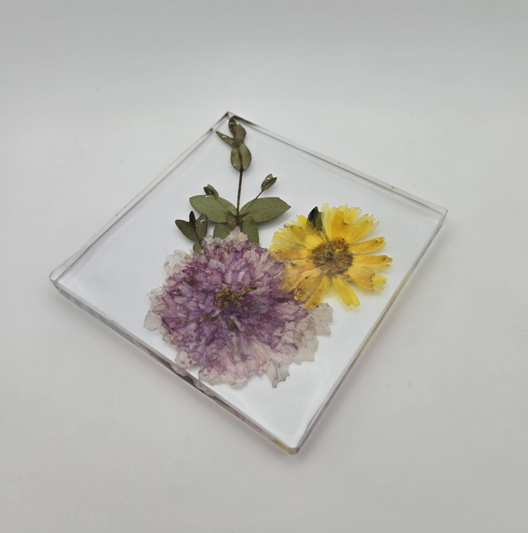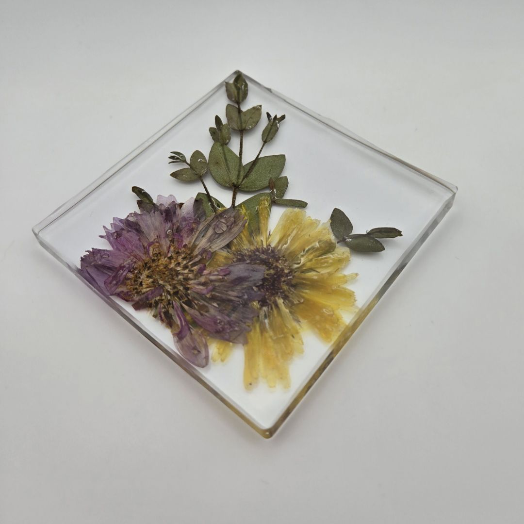 This coaster set contains pink and yellow cosmos and eucalyptus. Made from epoxy resin.