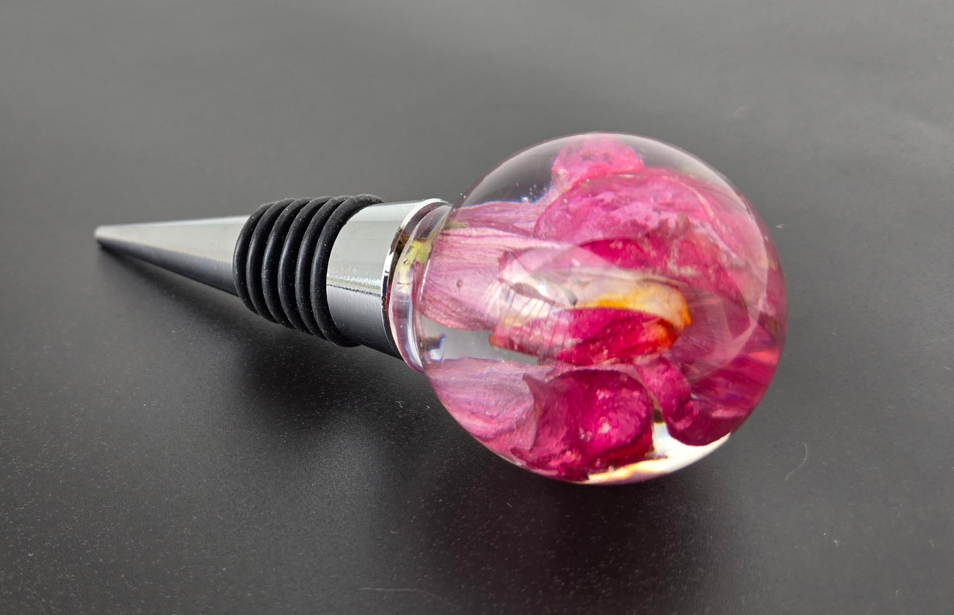 Handmade and one of a kind wine stopper made from epoxy resin and real preserved flowers. Featuring a couple of Fuchsia Snapdragons.