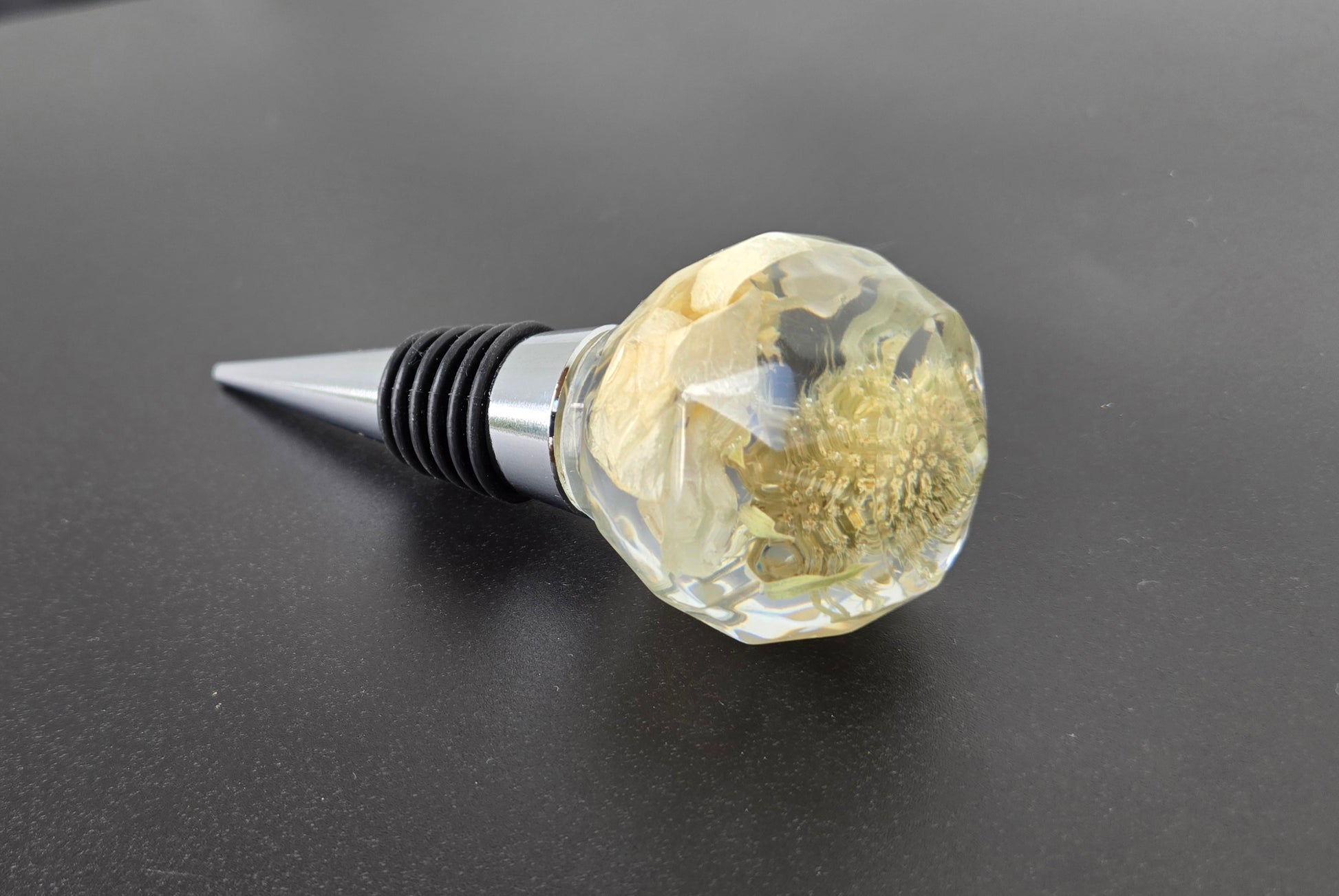 Handmade and one of a kind wine stopper made from epoxy resin and real preserved flowers. Featuring a thistle and white stock flower.
