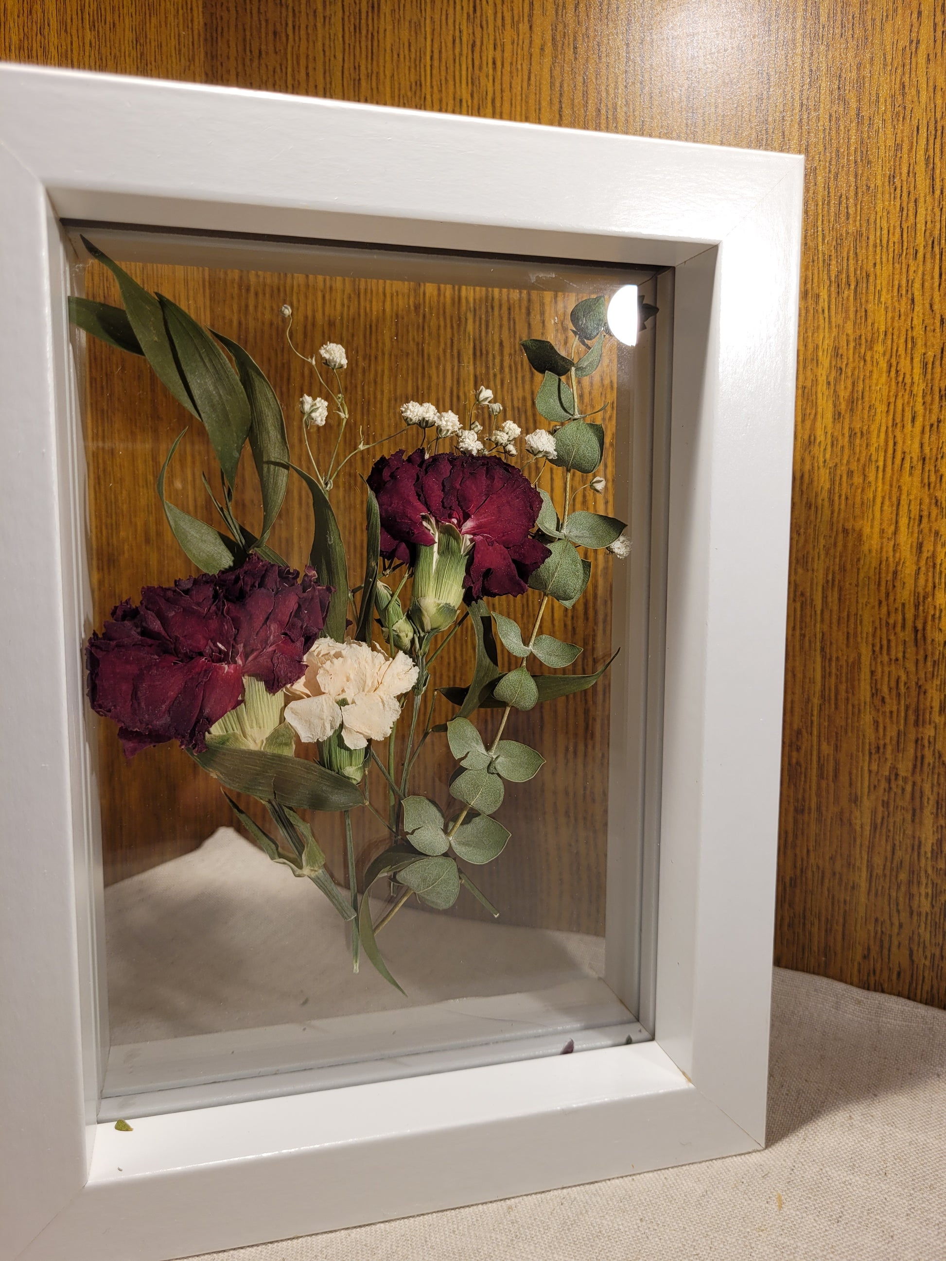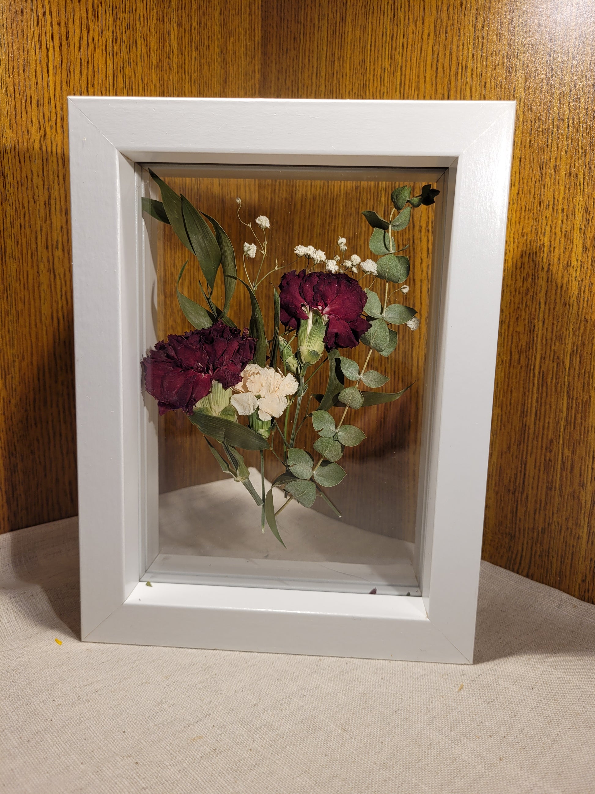 One of a kind real flower shadowbox frame. Flowers are thoughfully picked, dried and arranged by us. 6x8" frame.