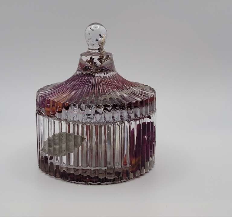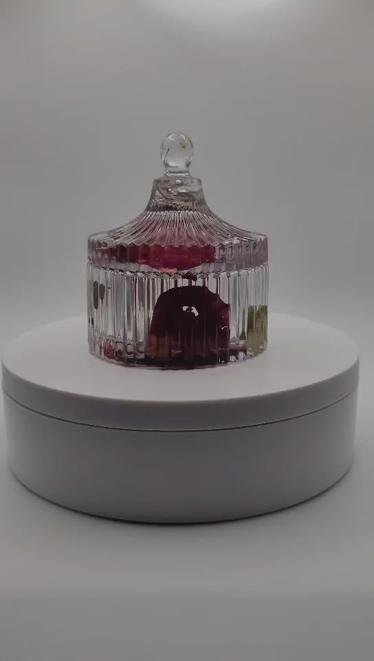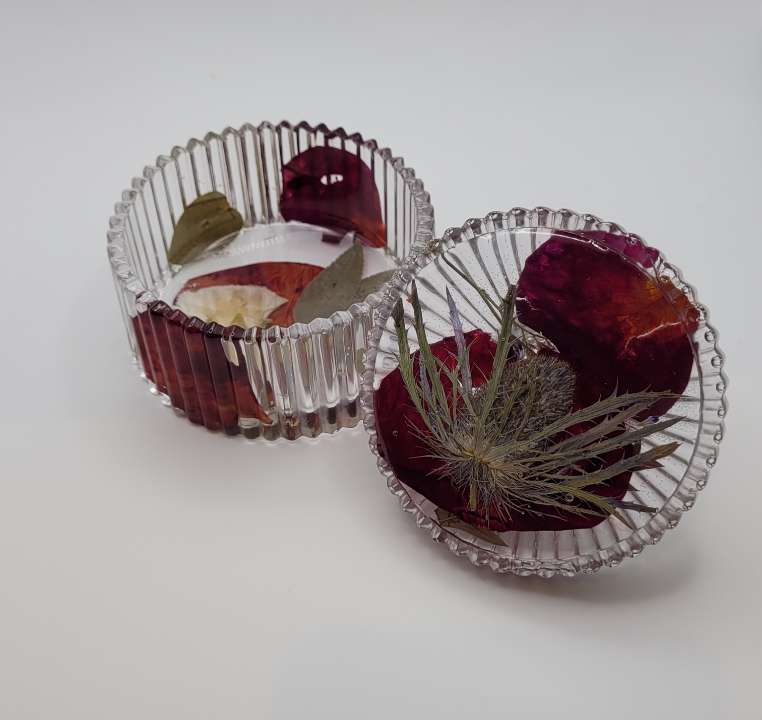 This trinket jar contains red rose petals, white carnation, a thistle, and greenery. Hand poured and one of a kind.