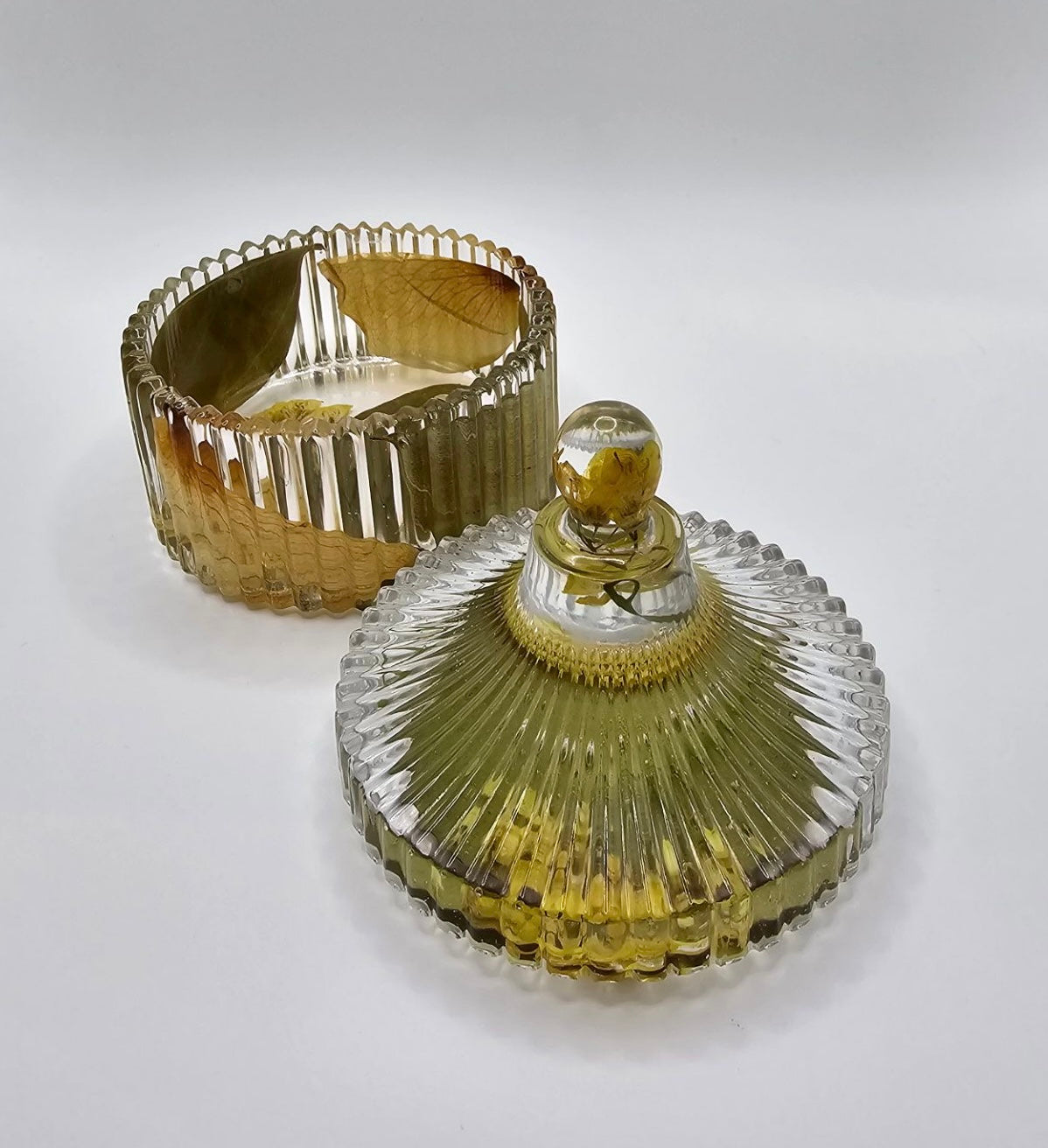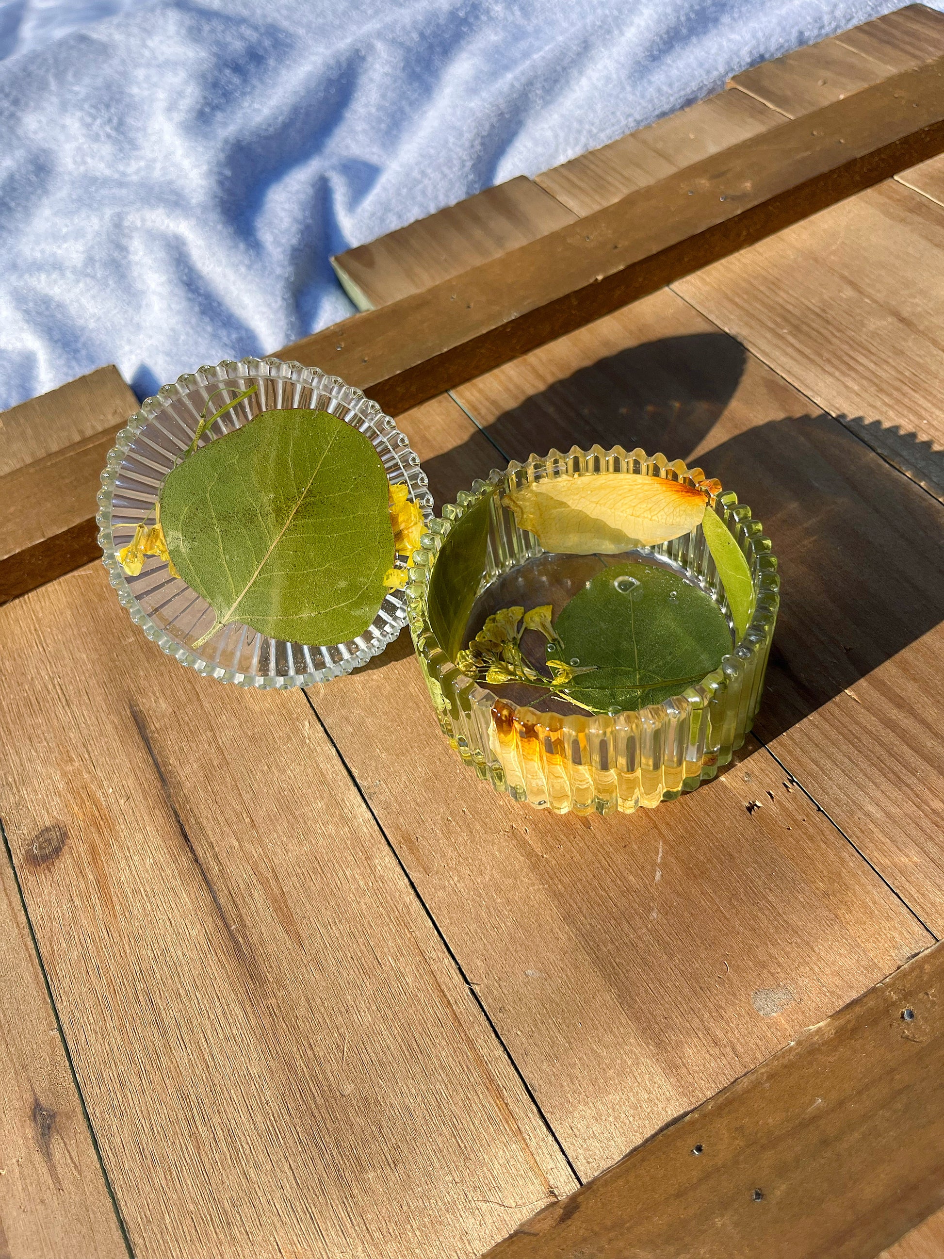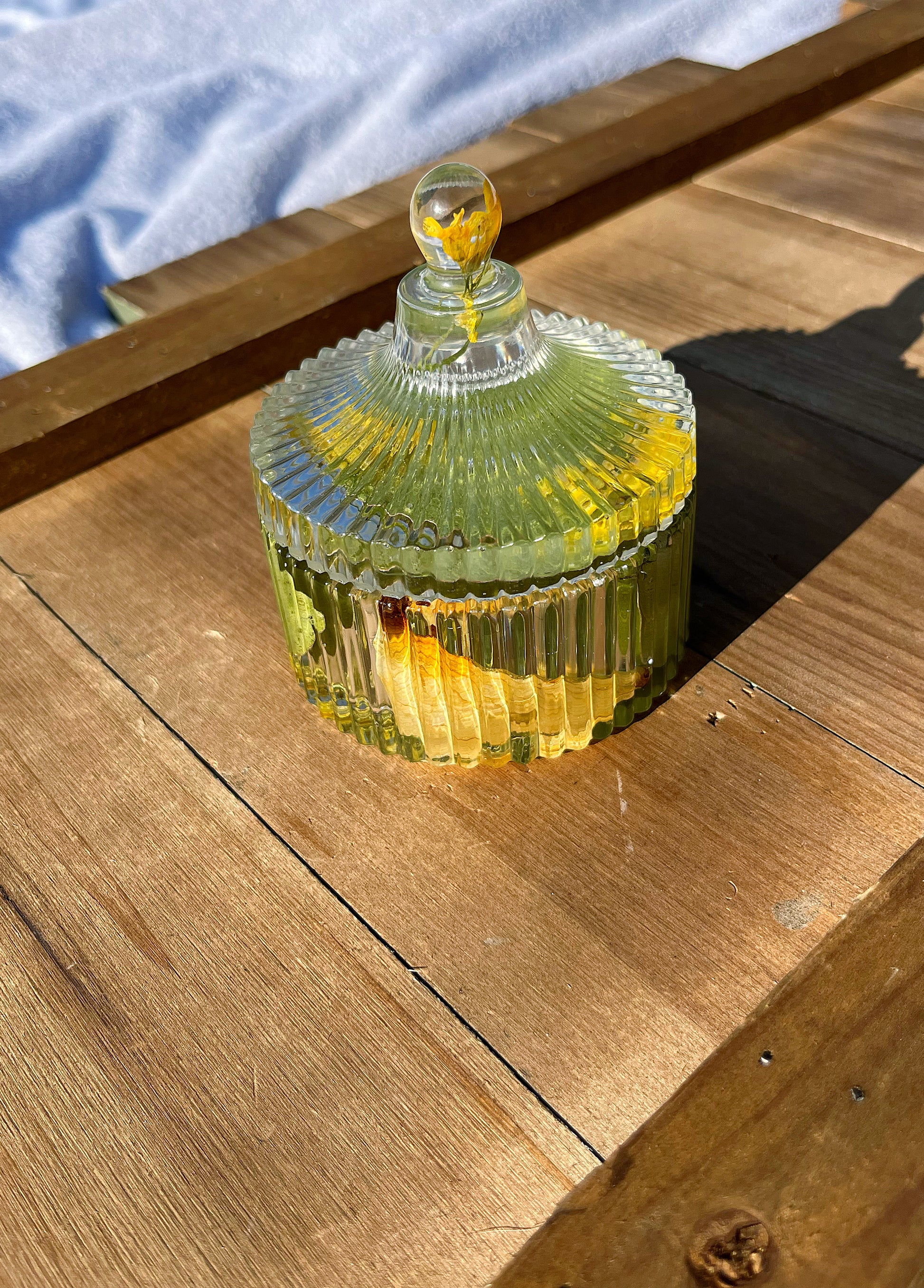 This trinket jar contains yellow rose petals, small canola flowers, and some vibrant green leaves. Hand poured and one of a kind.