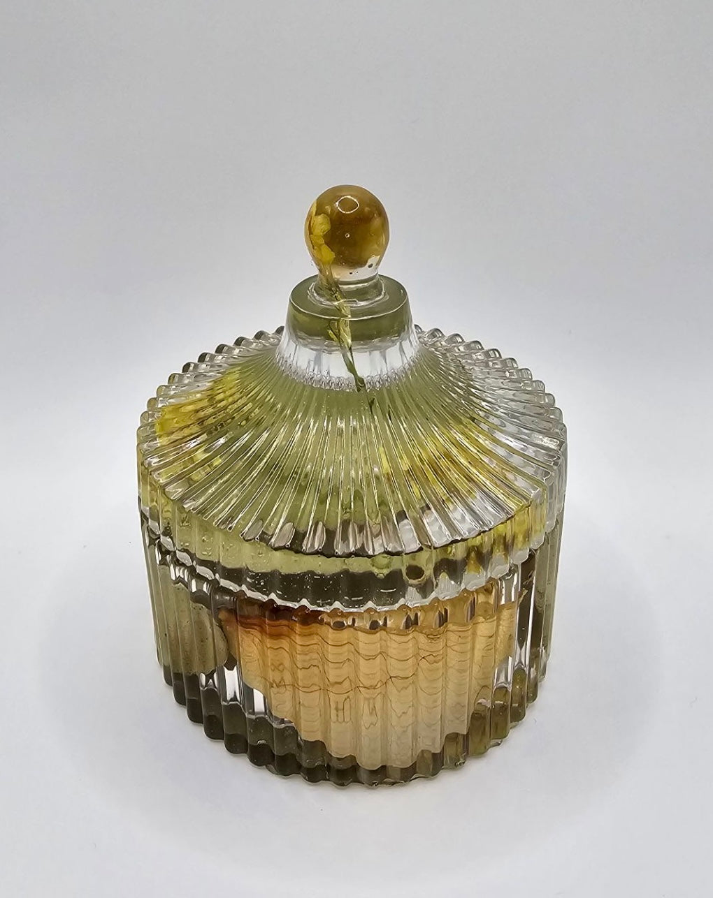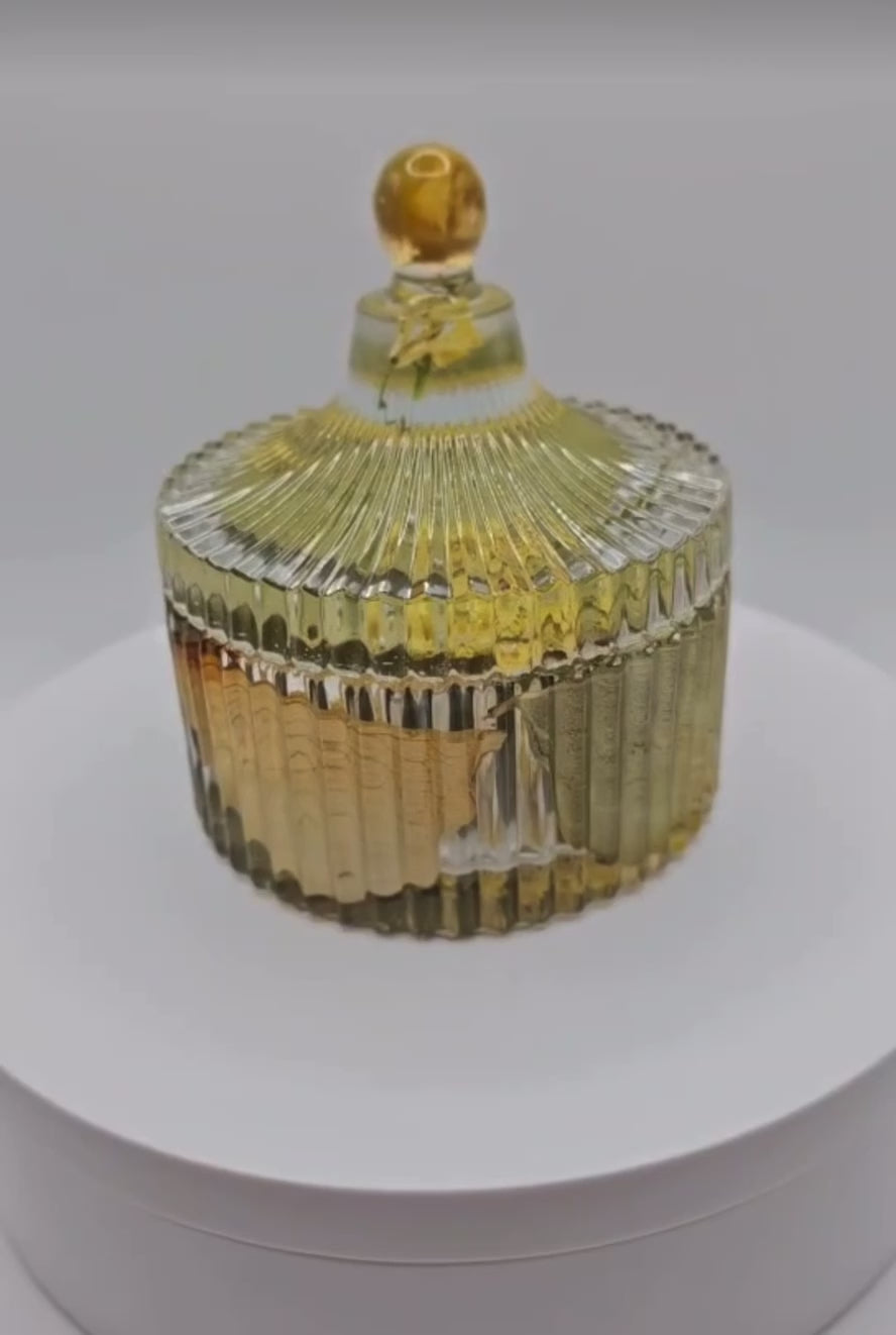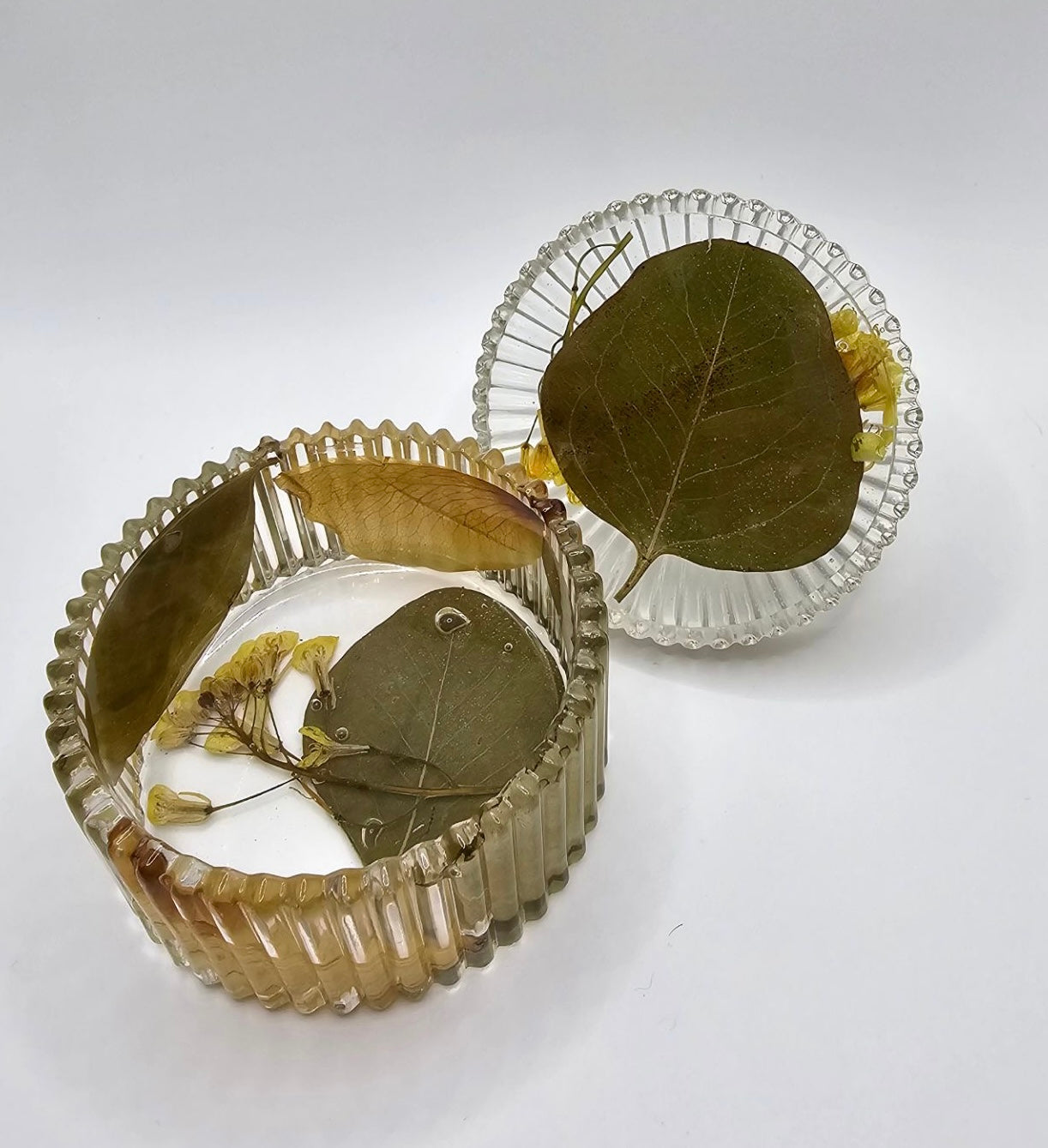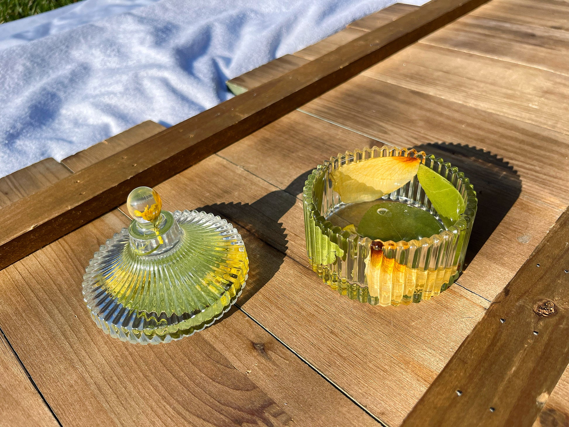 This trinket jar contains yellow rose petals, small canola flowers, and some vibrant green leaves. Hand poured and one of a kind.