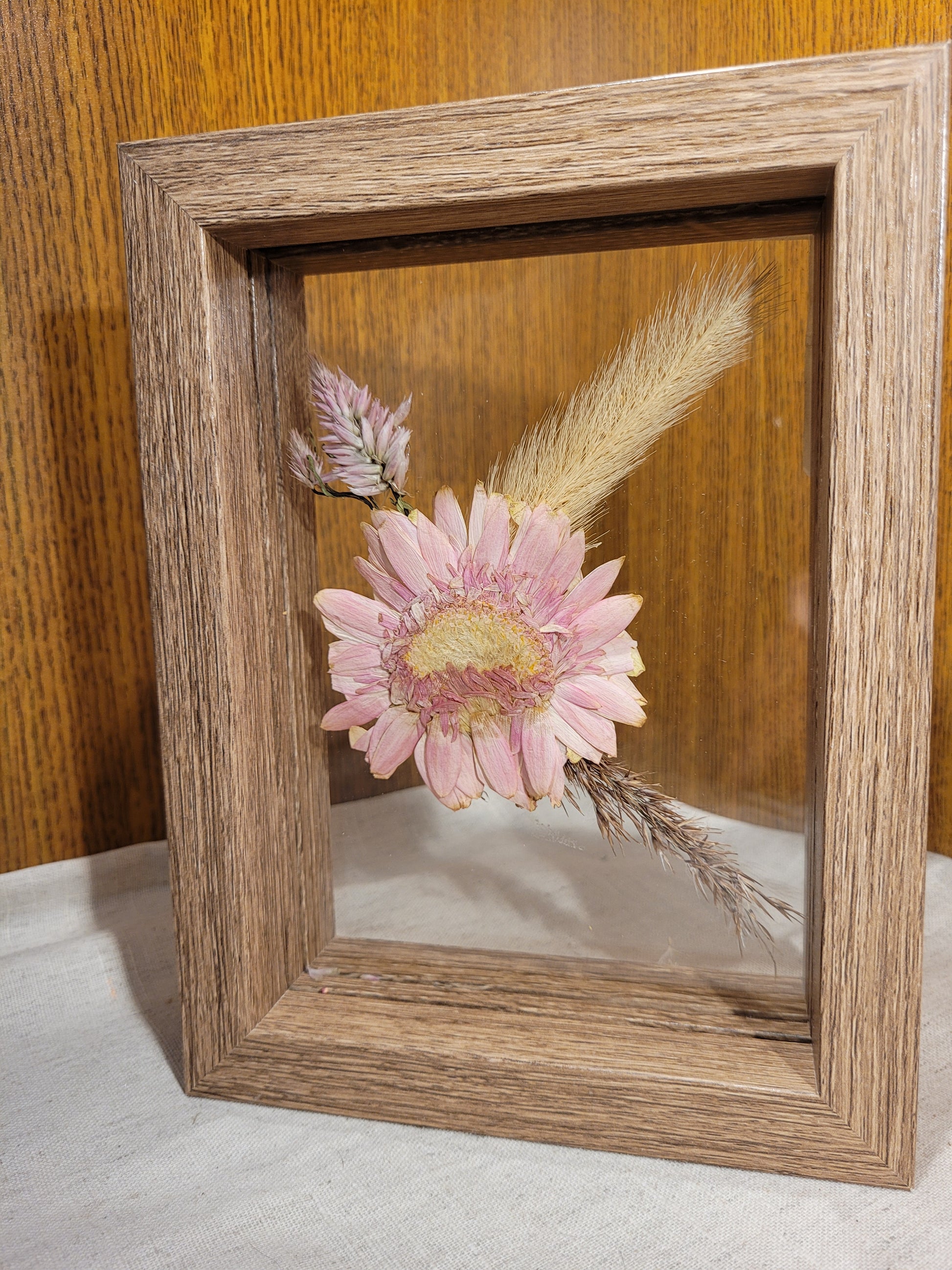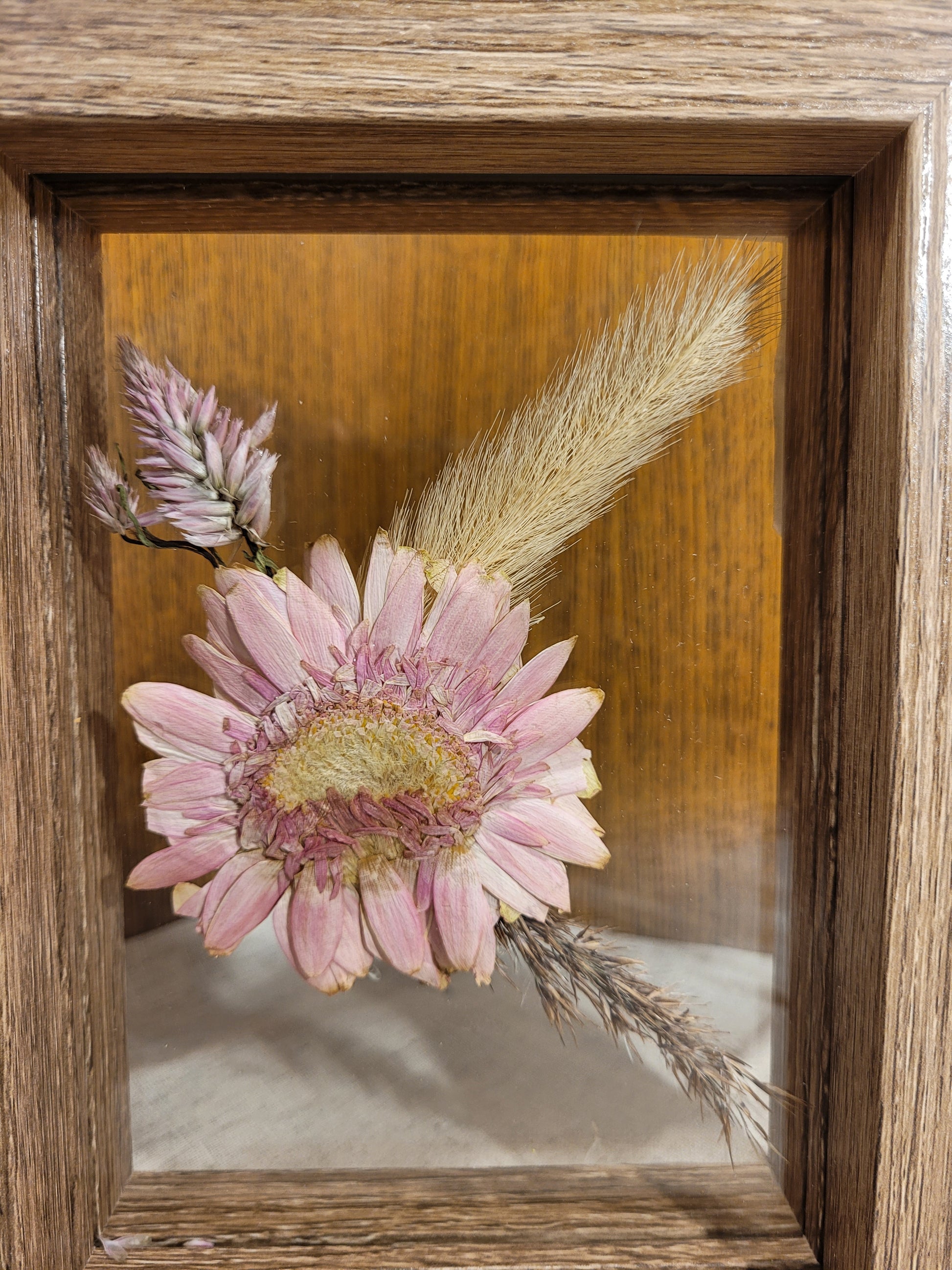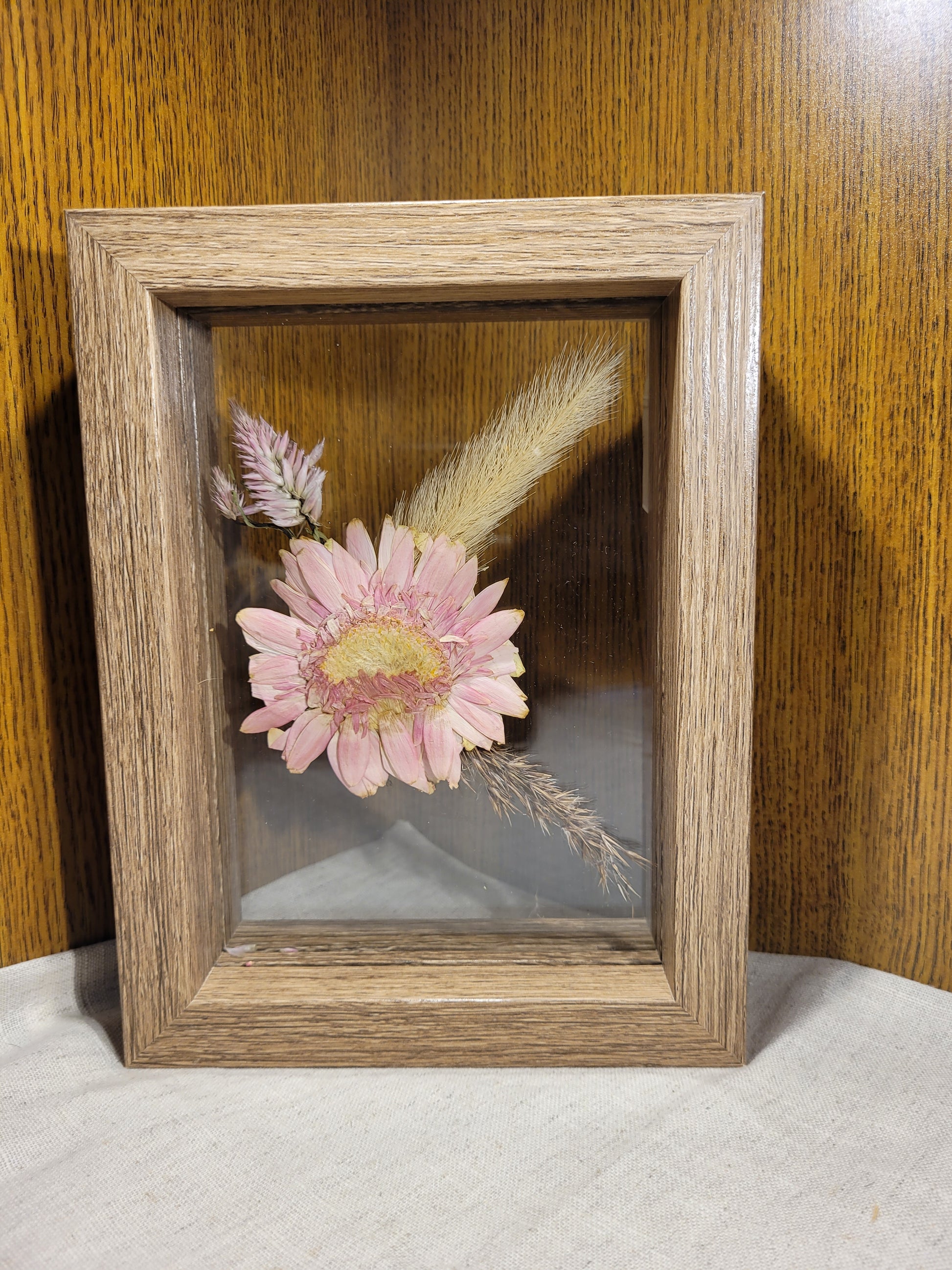 One of a kind real flower shadowbox frame. Flowers are thoughtfully picked, dried and arranged by us. 6x8"