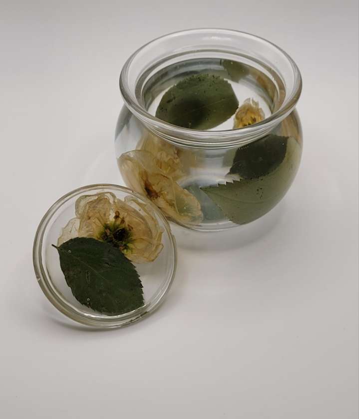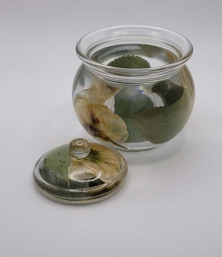 This trinket jar contains cream lisianthus and rose greenery. Hand poured and one of a kind.