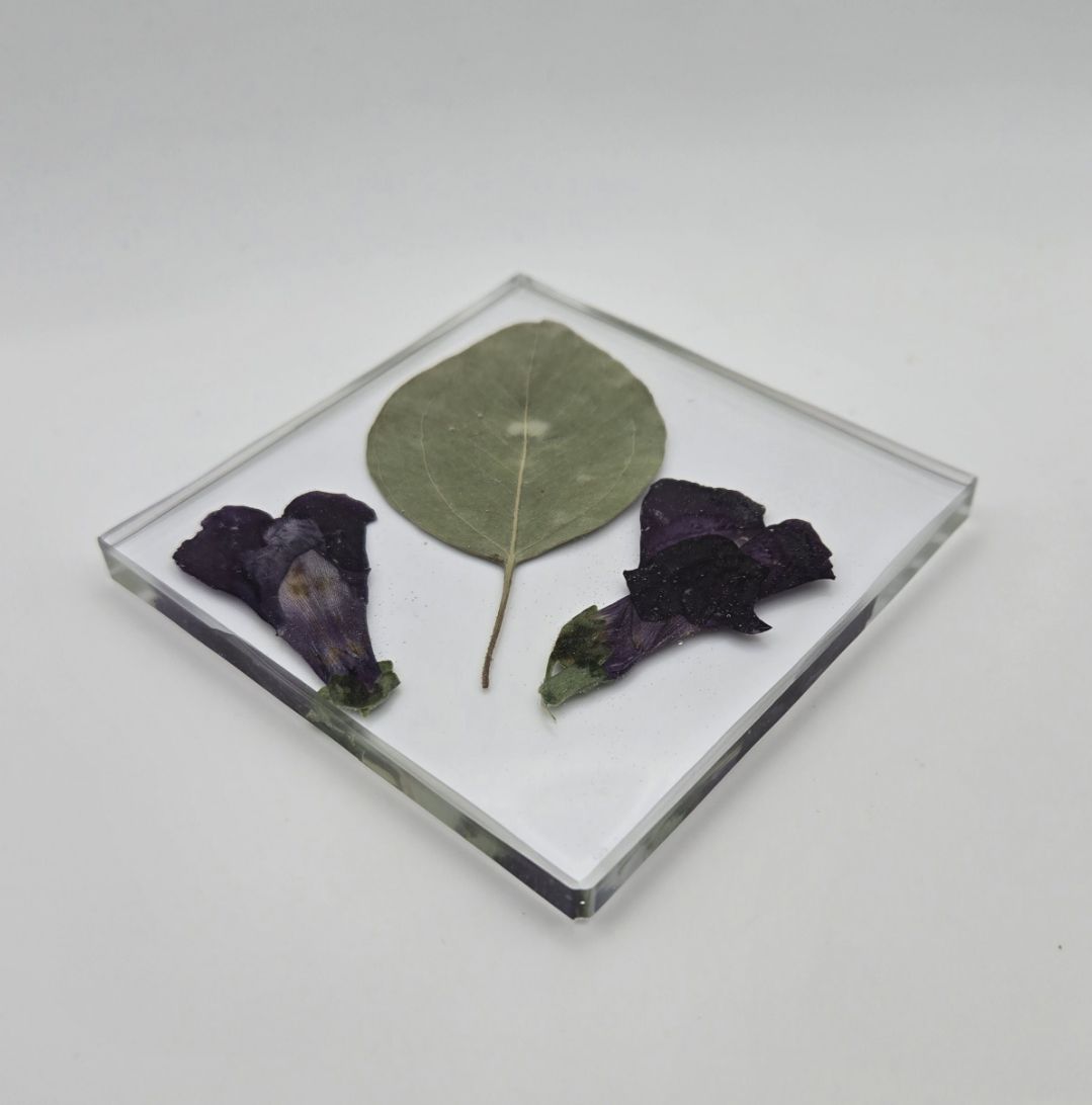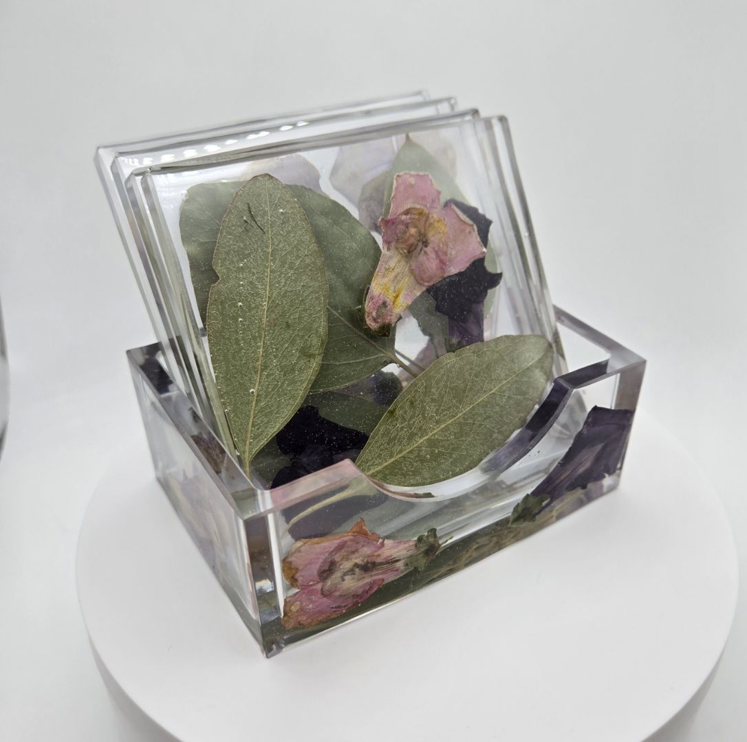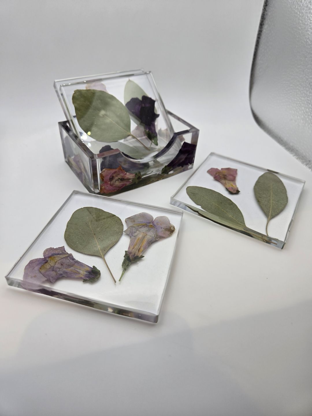 This coaster set contains pink and dark purple snap dragon flowers and some eucalyptus. Made from epoxy resin.