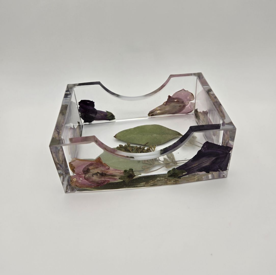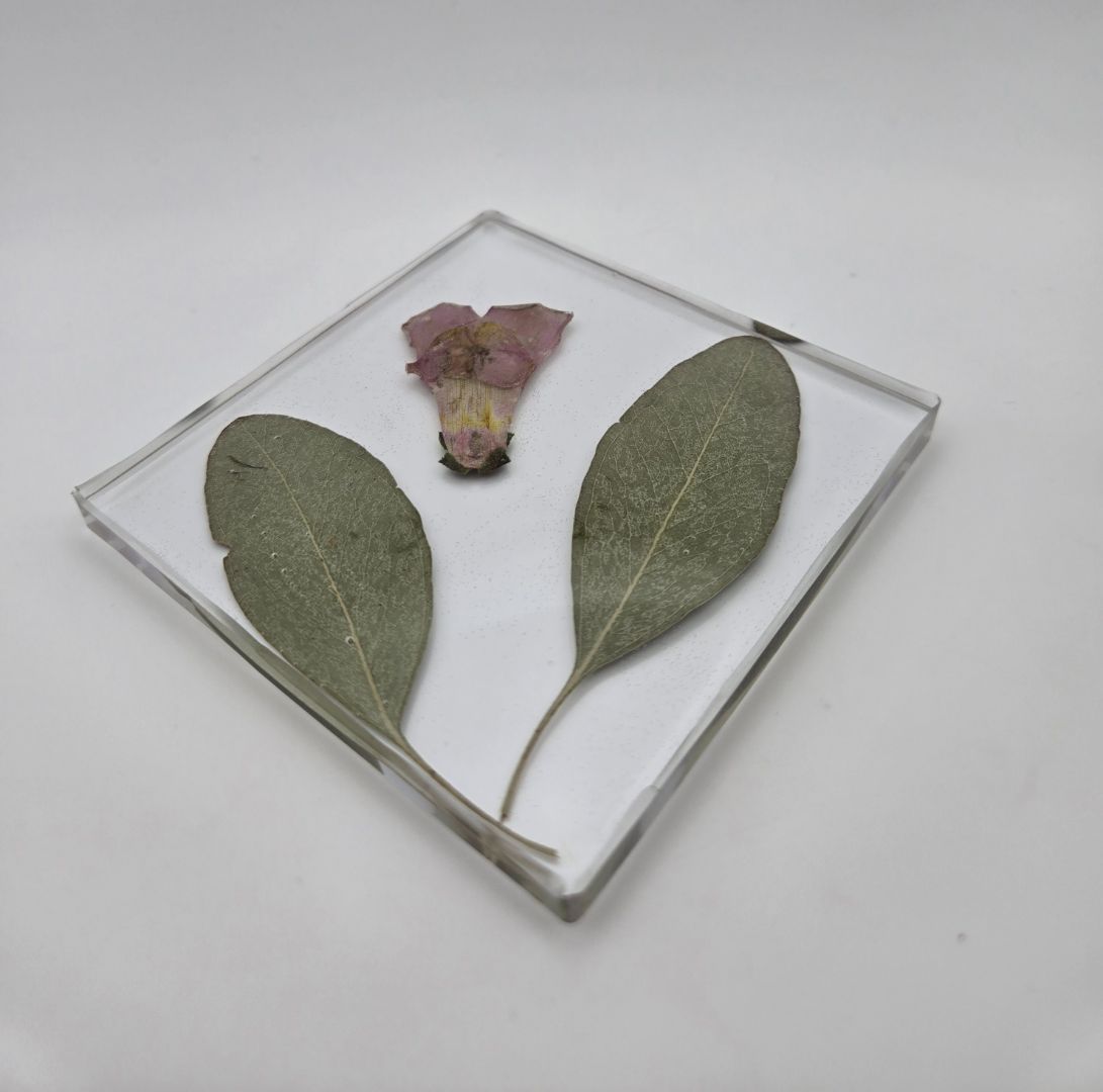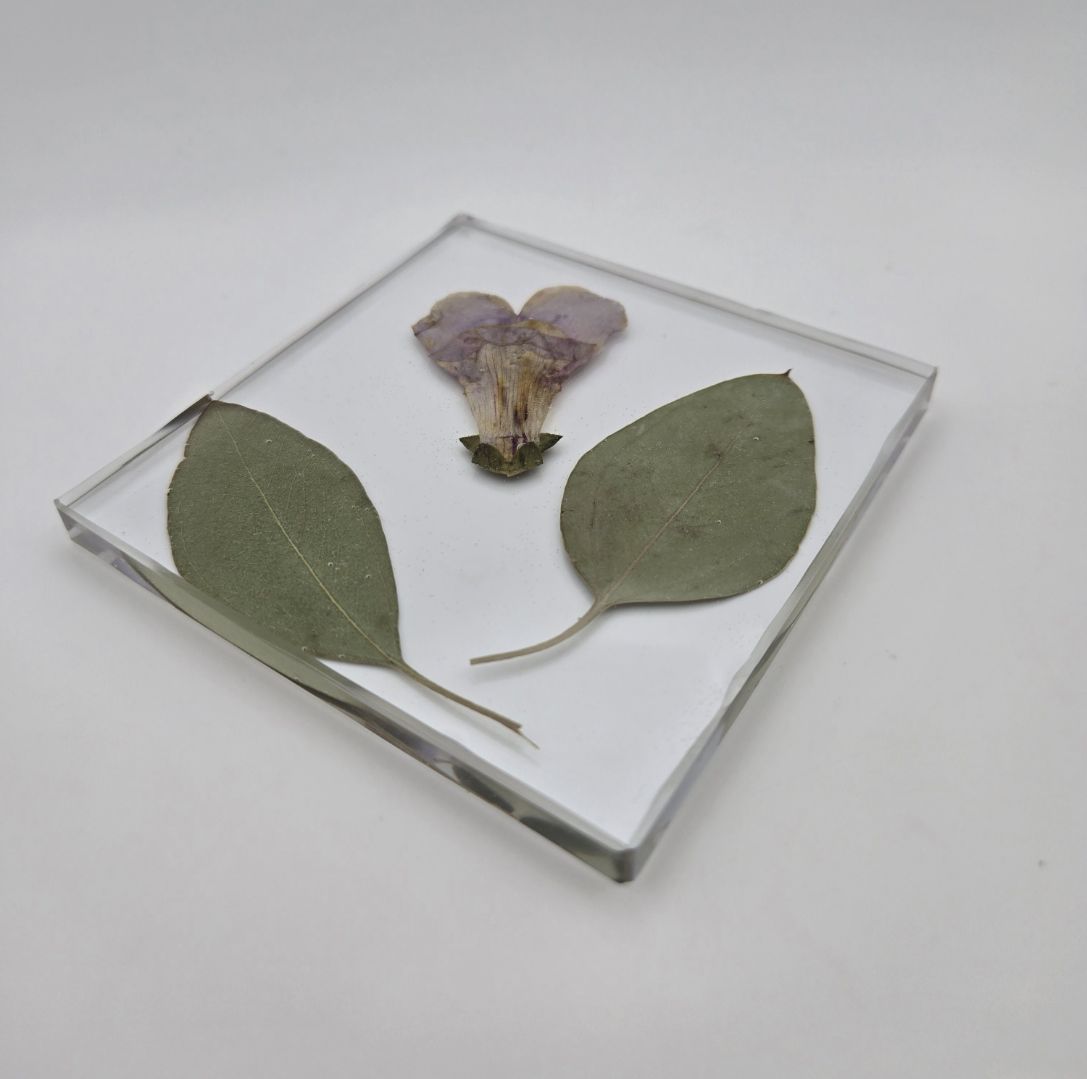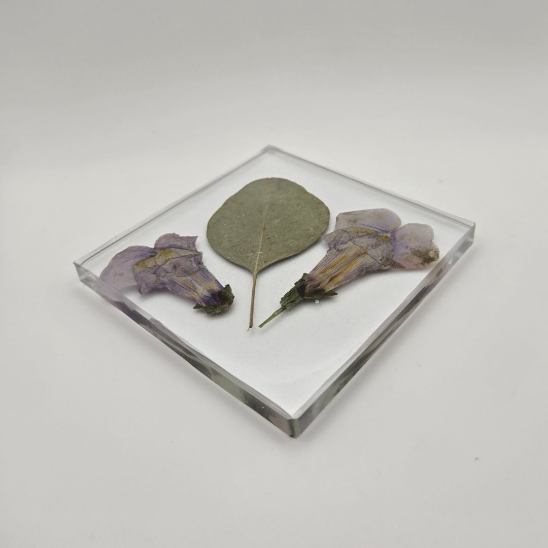 This coaster set contains pink and dark purple snap dragon flowers and some eucalyptus. Made from epoxy resin.