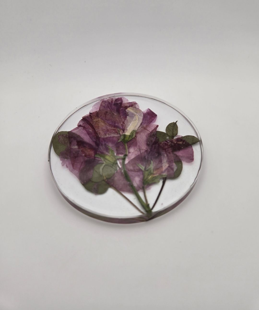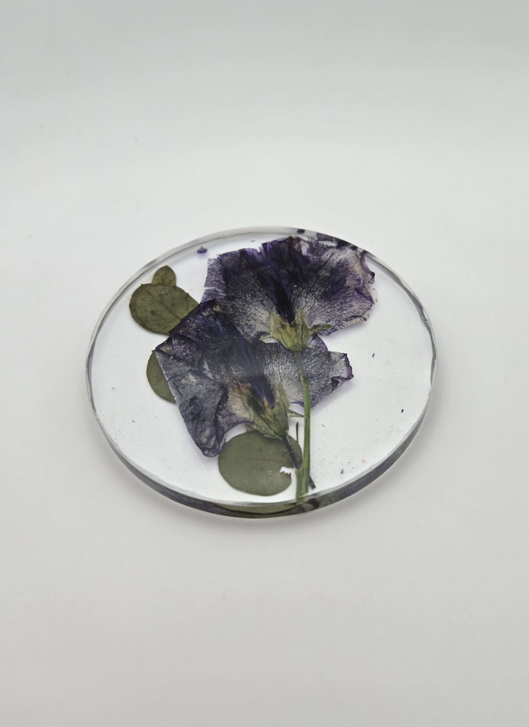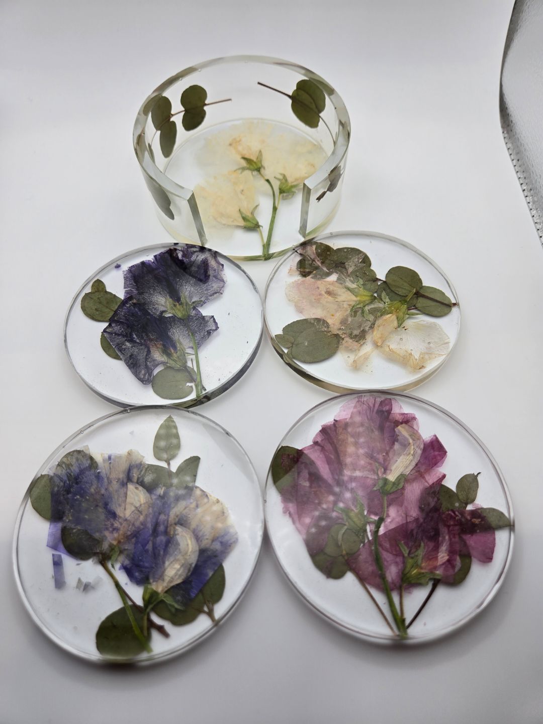 This coaster set contains various coloured sweet pea flowers and eucalyptus. Made from epoxy resin.