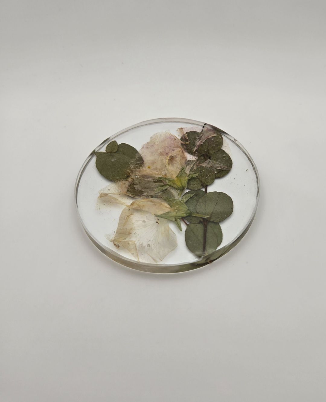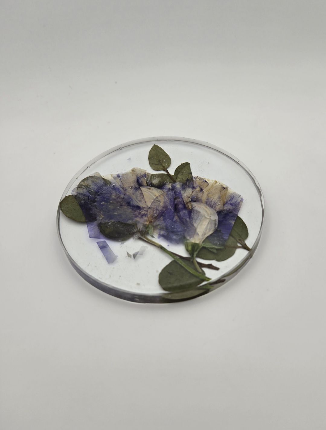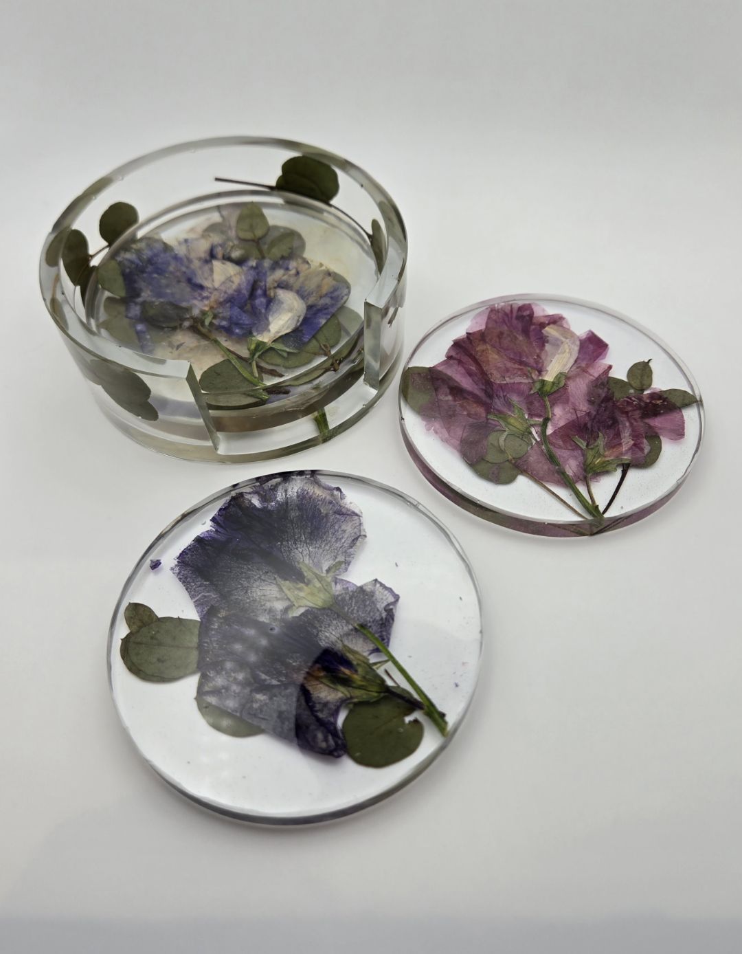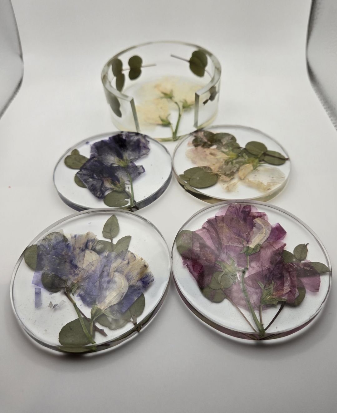 This coaster set contains various coloured sweet pea flowers and eucalyptus. Made from epoxy resin.