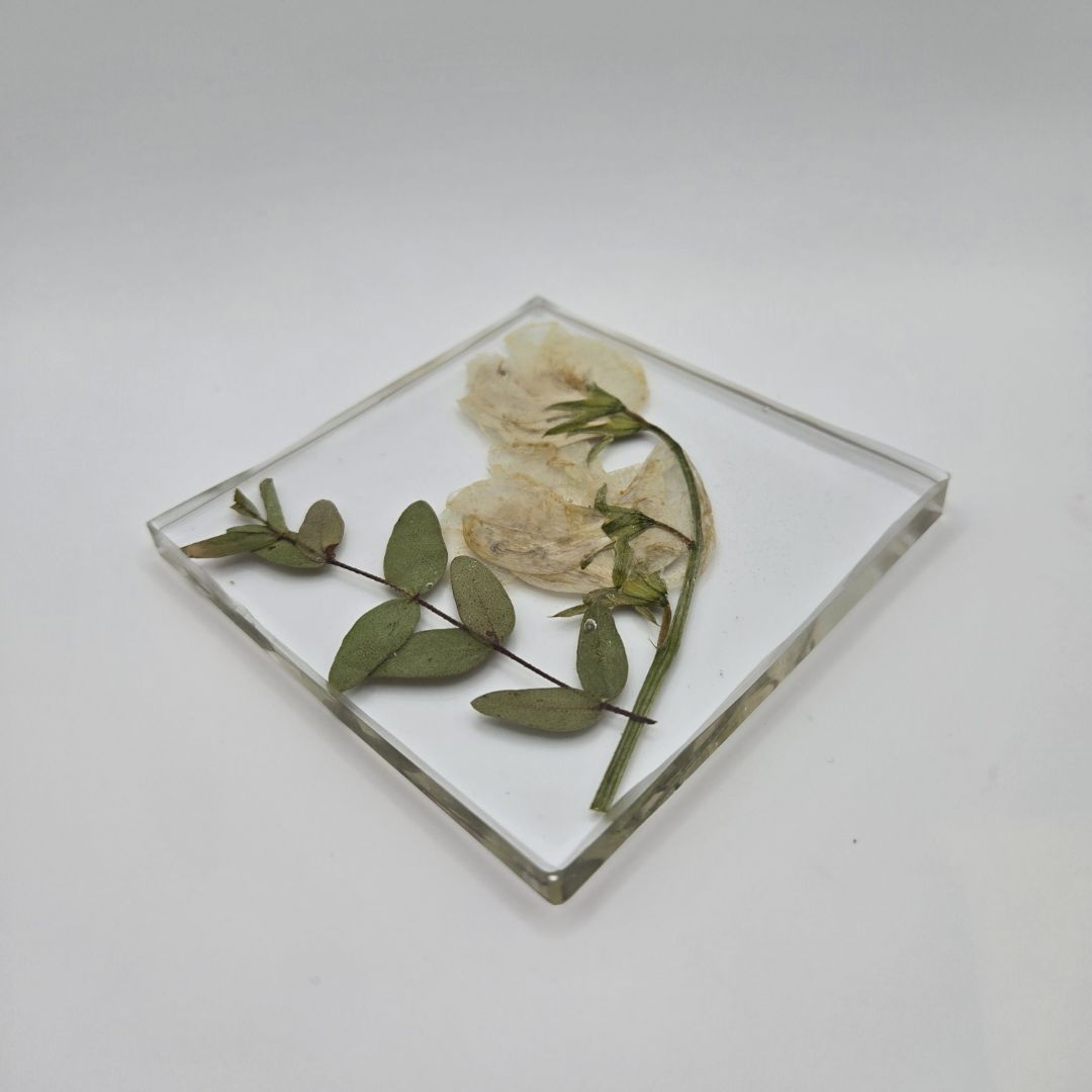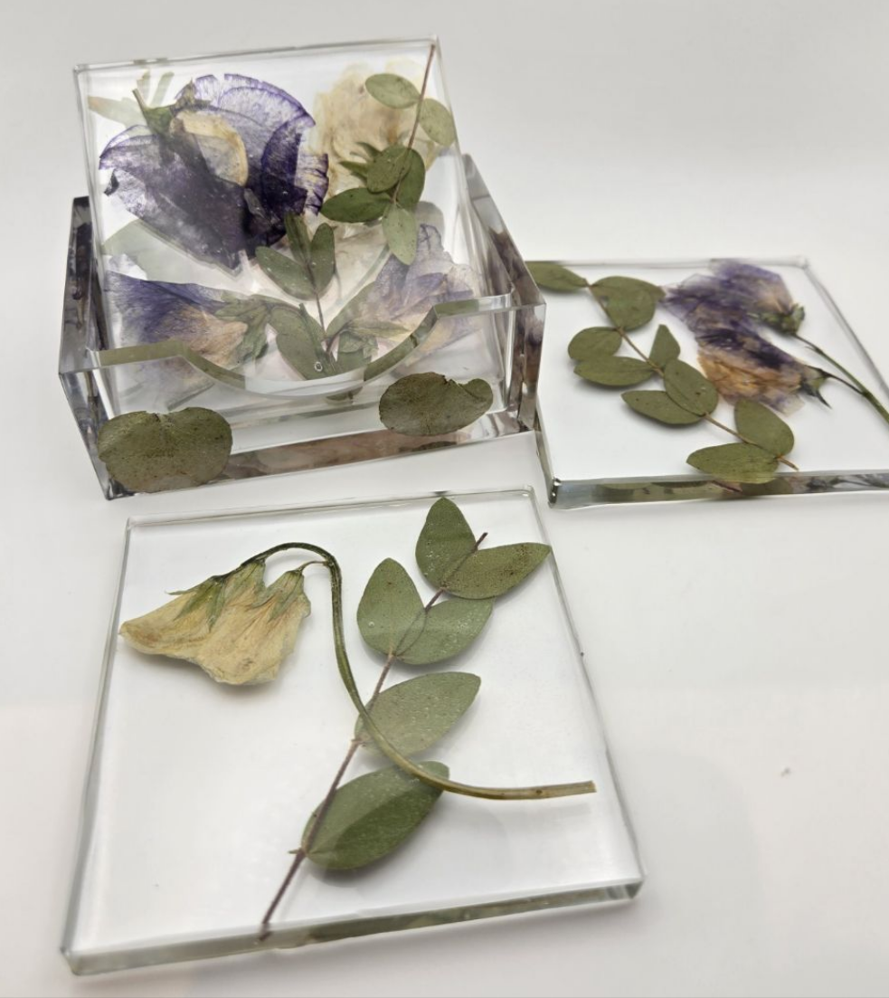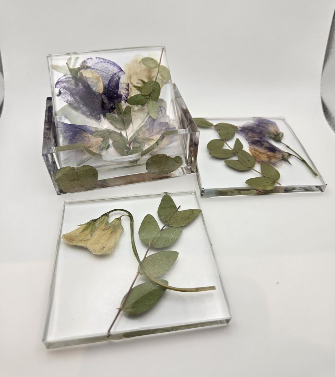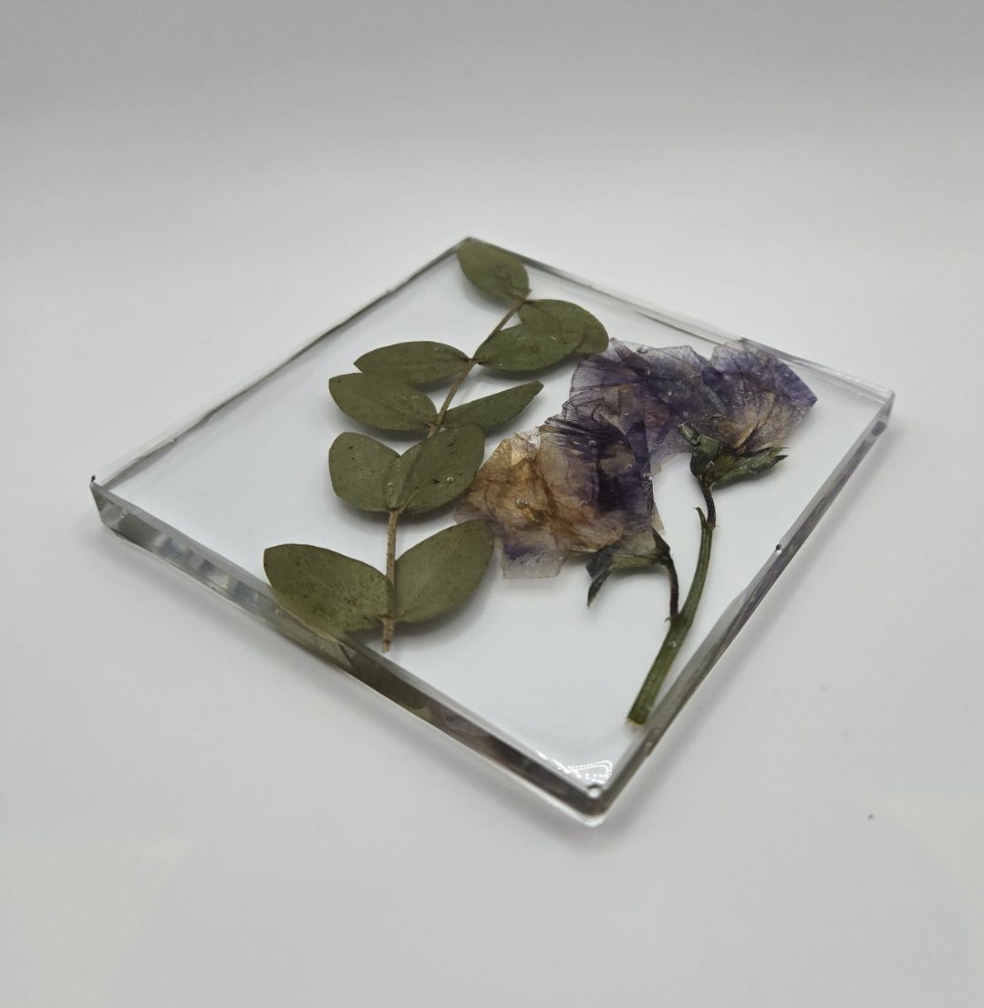 This coaster set contains white and purple sweet peas and eucalyptus. Made from epoxy resin.