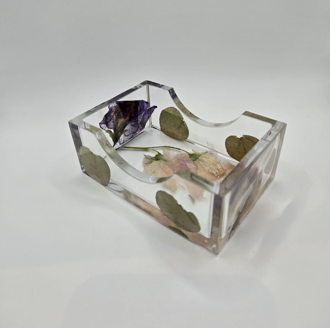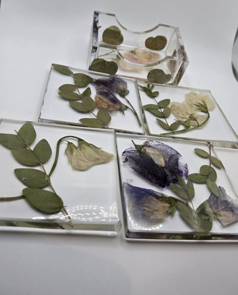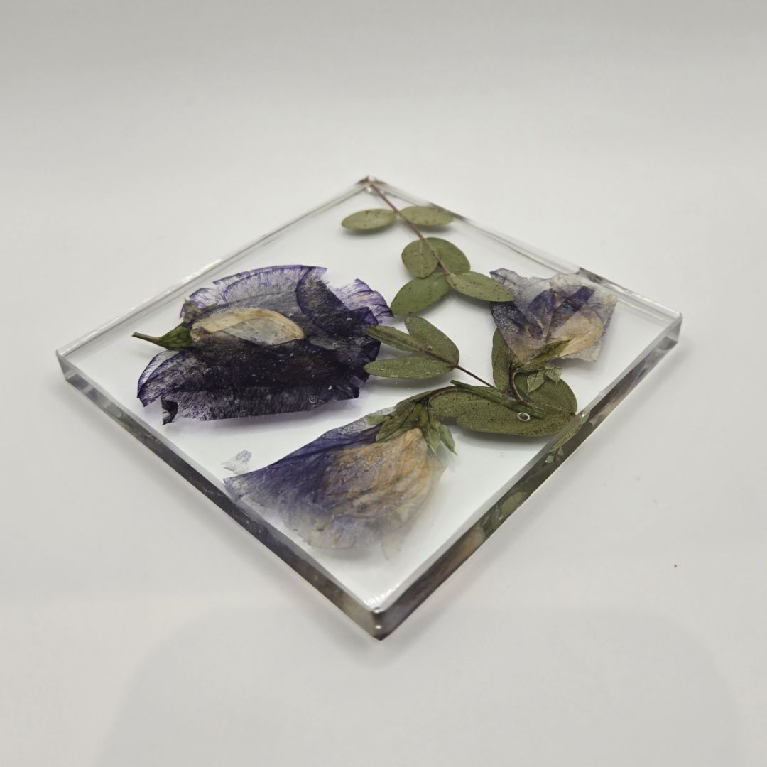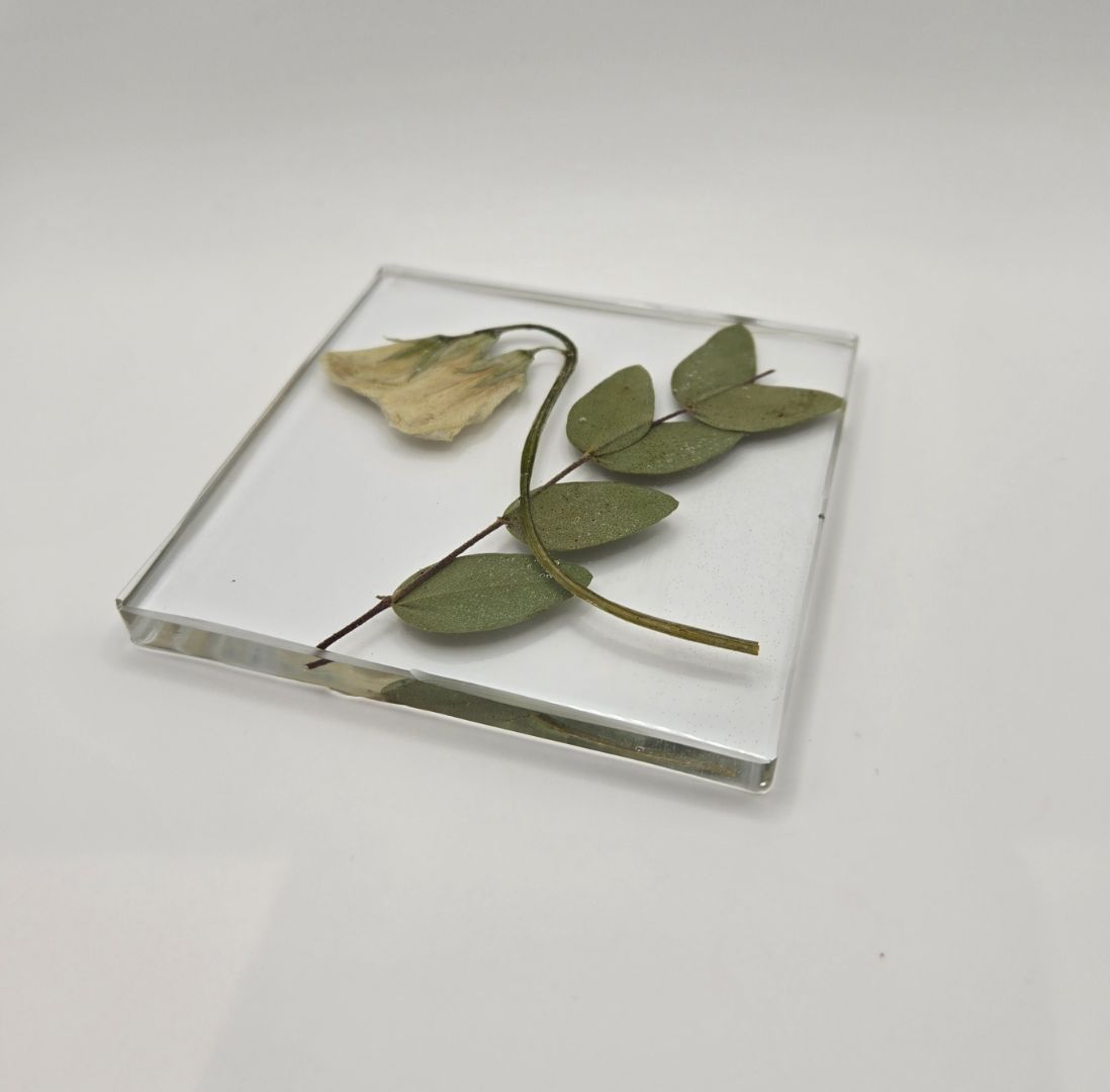 This coaster set contains white and purple sweet peas and eucalyptus. Made from epoxy resin.