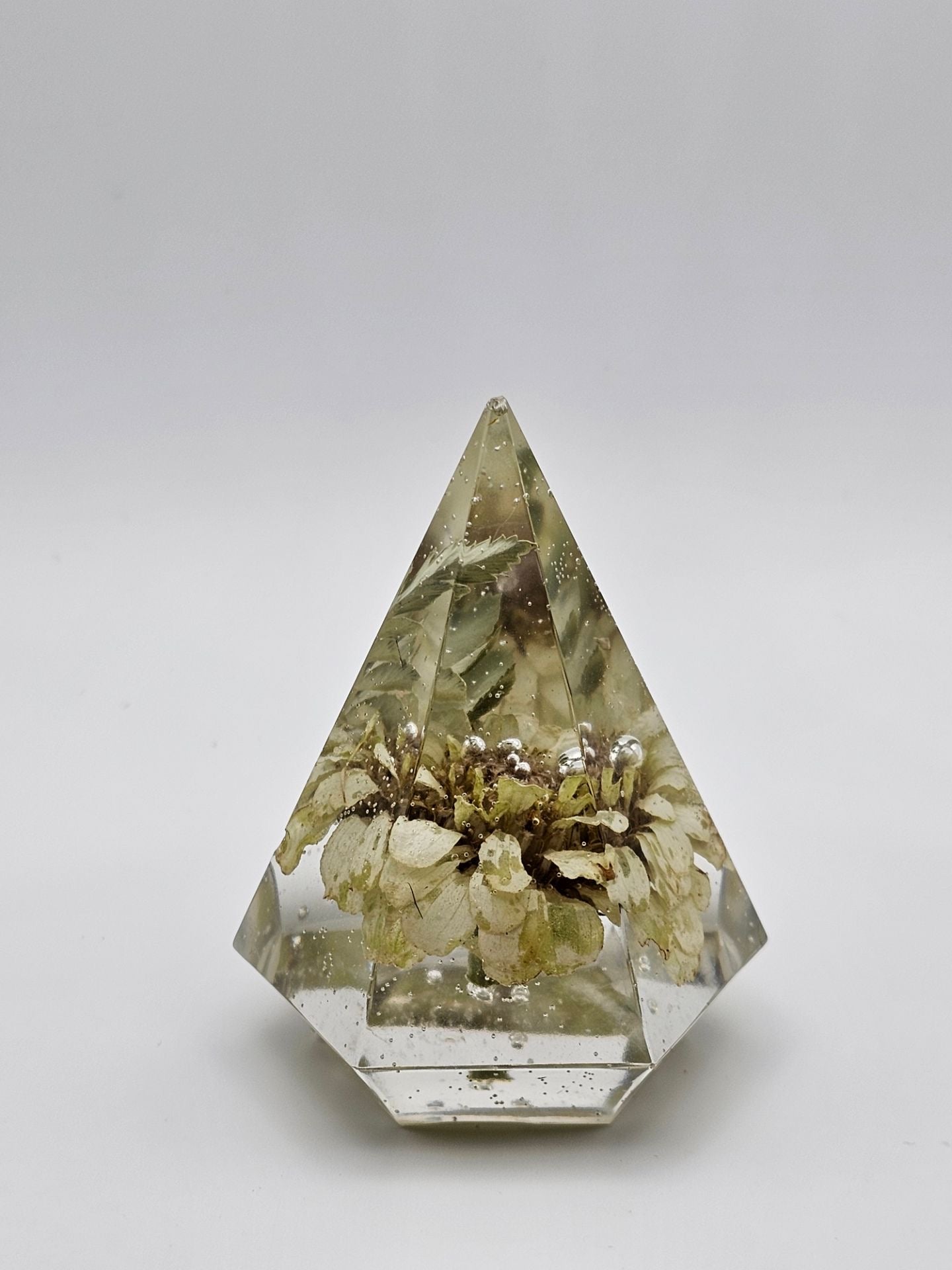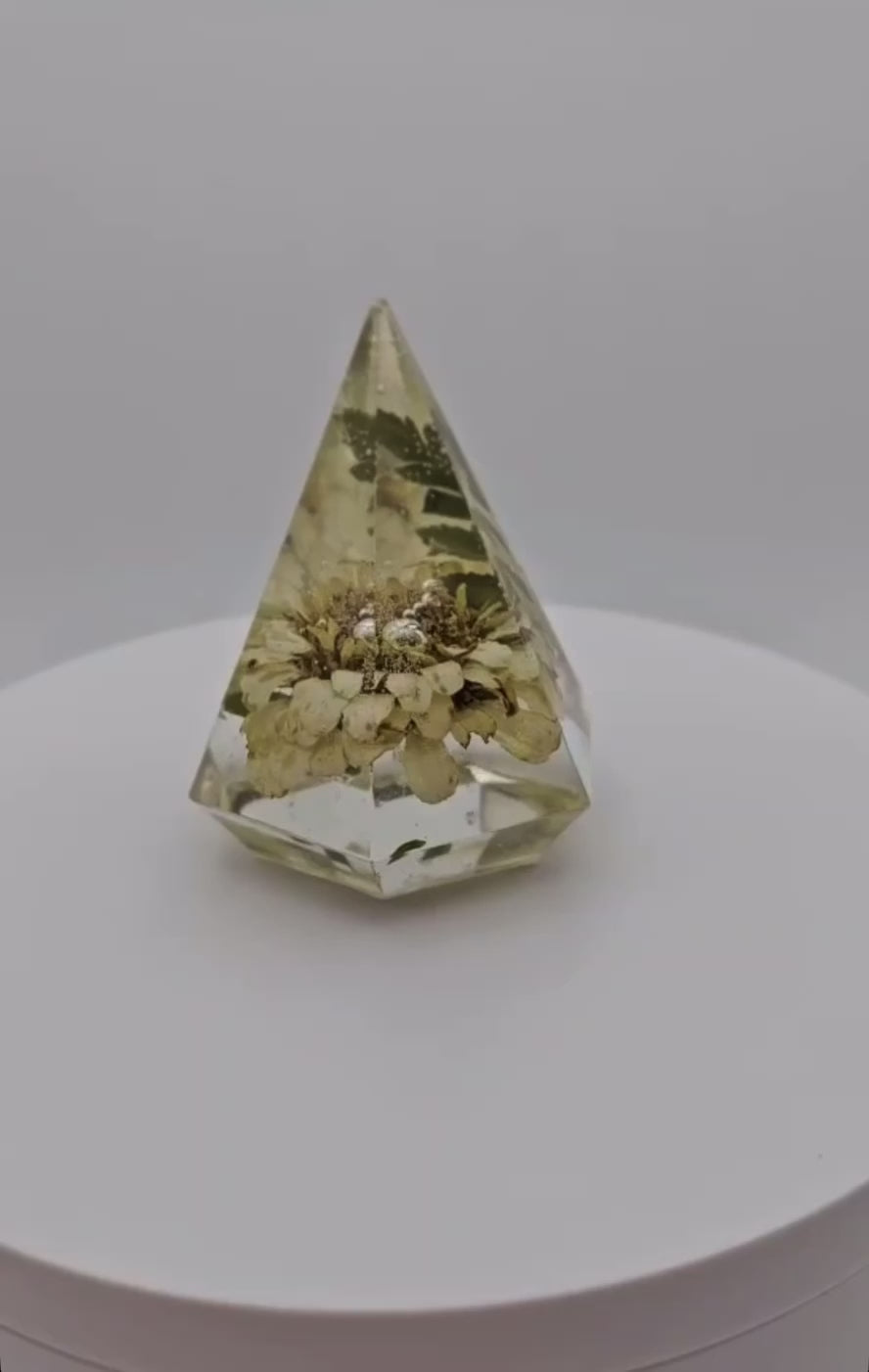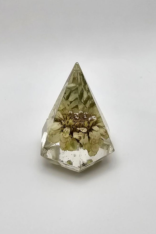 A sturdy stand to hold your rings when you're not wearing them! Each ring holder is handmade and one of a kind. Epoxy resin with a white zinnia flower and greenery.