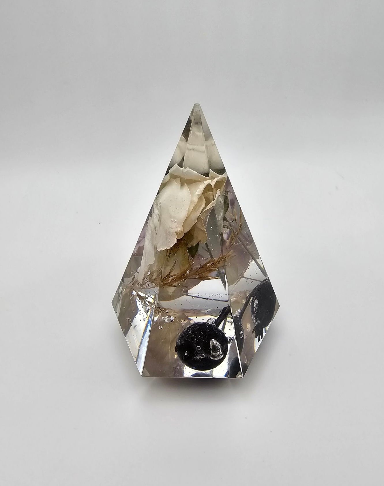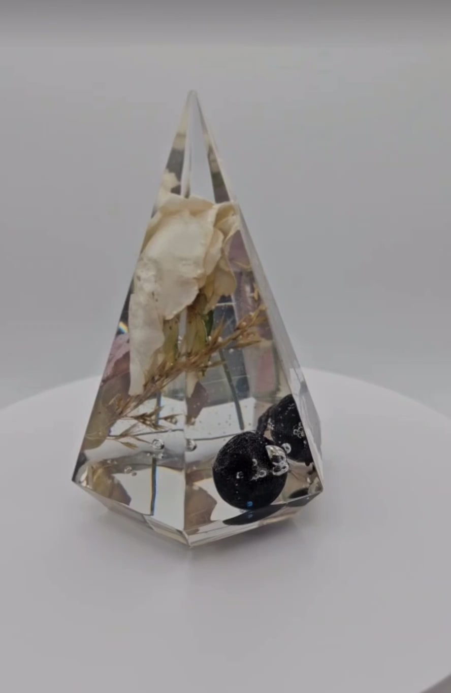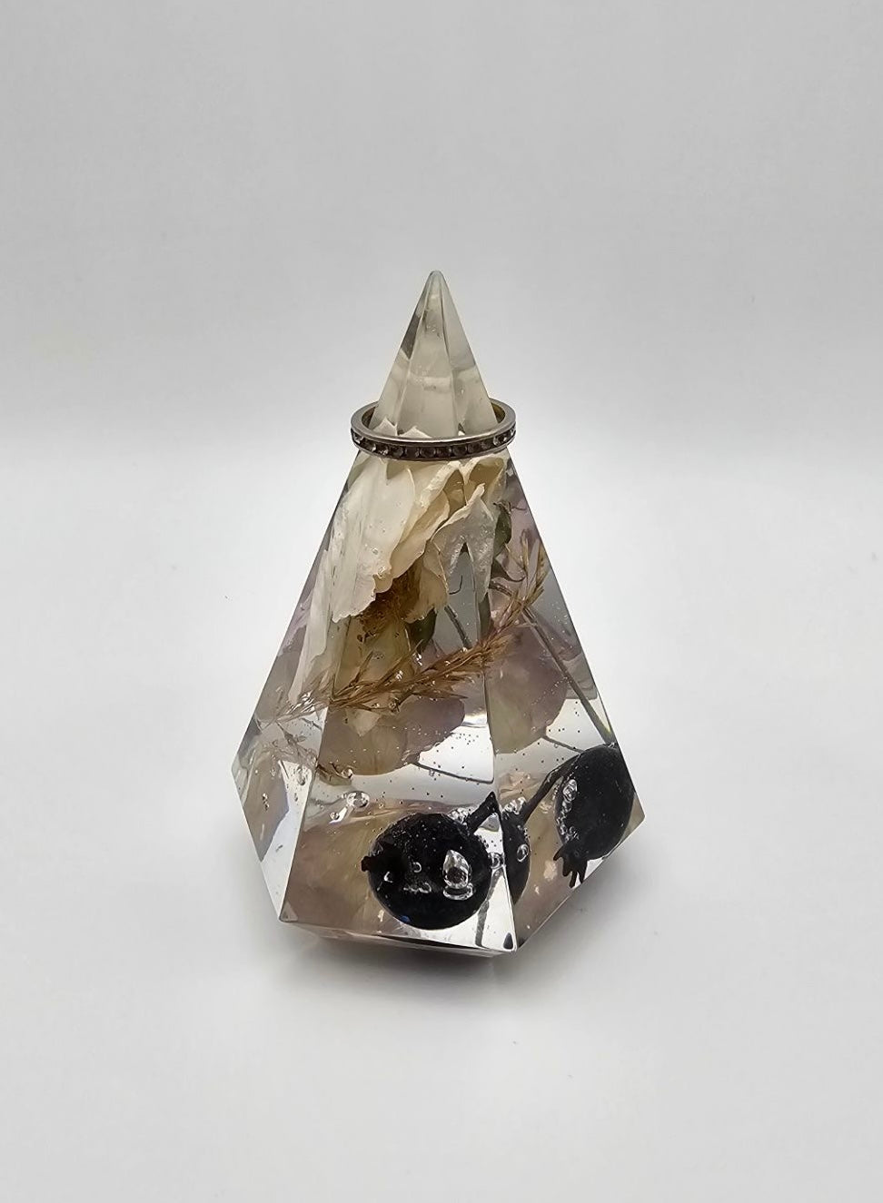 A sturdy stand to hold your rings when you're not wearing them! Each ring holder is handmade and one of a kind. Made with epoxy resin with a white spray rose, petals, and a little berry.